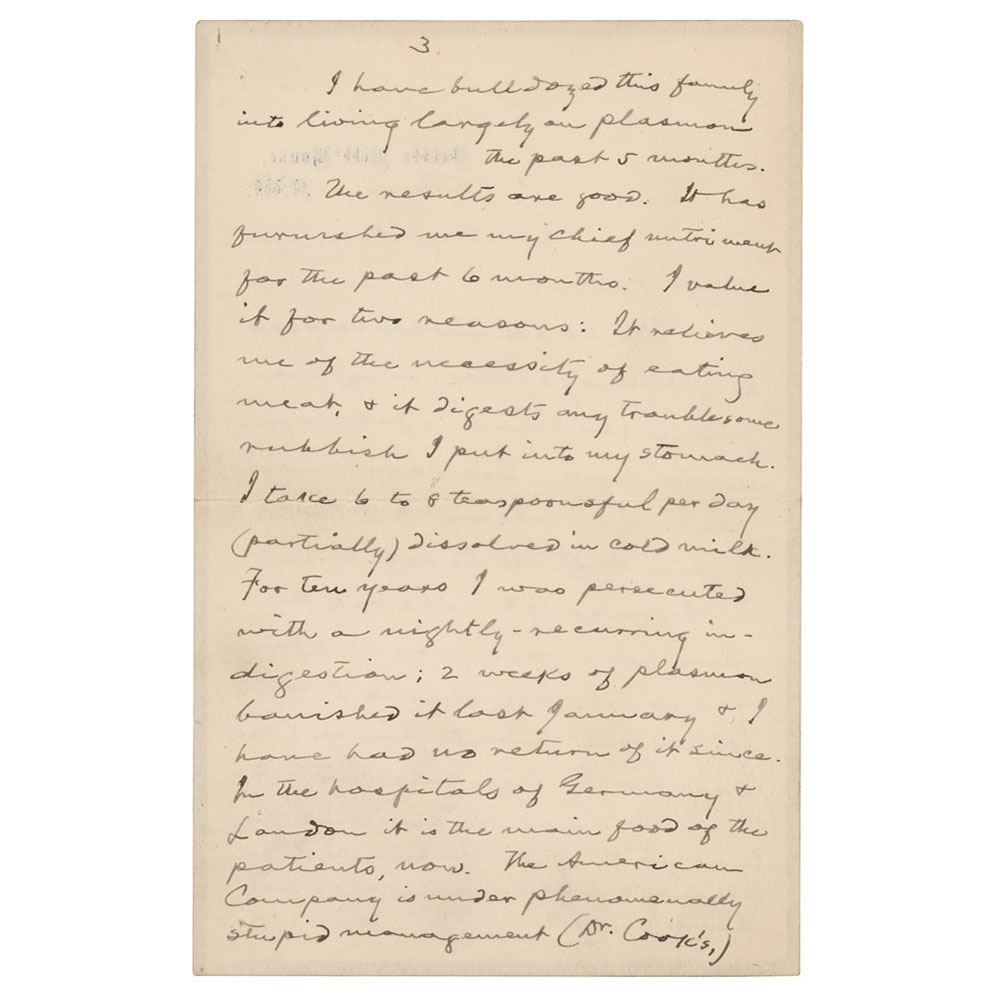 I have bulldozed this family into living largely on plasmon the past five months. The results are good. It has furnished me my chief nutrient for the past 6 months. I value it for two reasons: It relieves me of the necessity of eating meat, & it digests my troublesome rubbish I put into my stomach. I take 6 to 8 teaspoonsful per day (partially) dissolved into cold milk. For ten years I was persecuted with a nightly-recurring indigestion; 2 weeks of plasmon banished it last January & I have had no return of it since. In the hospitals of Germany & London it is the main food of the patients, now. The American Company is under phenomenally stupid management (Dr. Cook's) but no matter, plasmon will make its way.