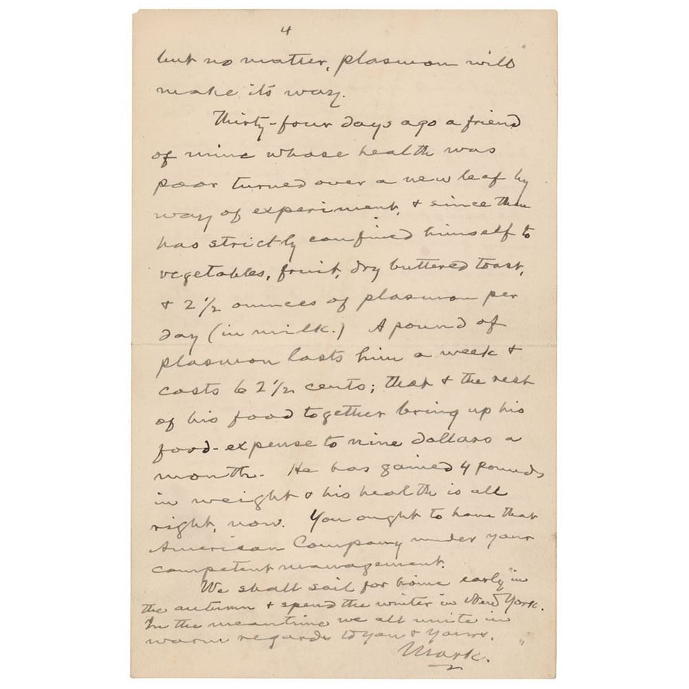 Thirty-four days ago a friend of mine whose health was poor turned over a new leaf by way of experiment, & since then has strictly confined himself to vegetables, fruit, dry buttered toast, & 2 1/2 ounces of plasmon per day (in milk). A pound of plasmon lasts him a week & costs 62 1/2 cents; that & the rest of his food together bring up his food-expense to nine dollars a month. He has gained 4 pounds in weight & his health is all right, now. You ought to have that American Company under your competent management. We shall sail for home early in the autumn & spend the winter in New York. In the meantime we all unite in warm regards to you & yours." In fine condition.