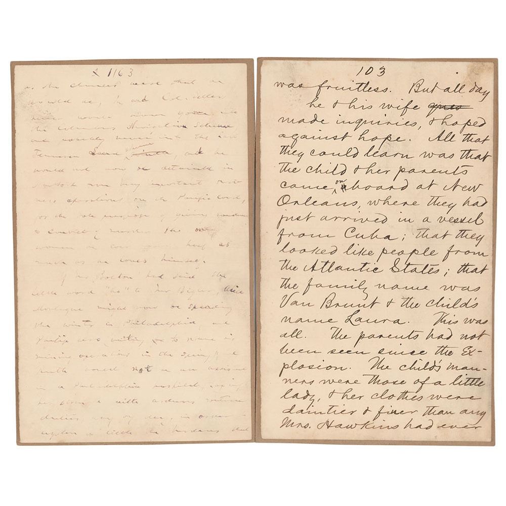 Unsigned handwritten manuscript pages by Samuel Clemens and Charles Dudley Warner, each one page, 5 x 8, no date but circa 1873. Pages from the manuscript for The Gilded Age: A Tale of Today, a collaborative novel written by Mark Twain and Charles Dudley Warner. Marked as page "103" at the top, Clemens writes, in full: "was fruitless. But all day he & his wife made inquiries, & hoped against hope. All that they could learn was that the child and her parents came on board at New Orleans, where they had just arrived in a vessel from Cuba; that they looked like people from the Atlantic States; that the family name was Van Brunt & the child's name Laura. This was all. The parents had not been seen since the explosion. The child's manners were those of a little lady, and her clothes were daintier & finer than any Mrs. Hawkins had ever."
