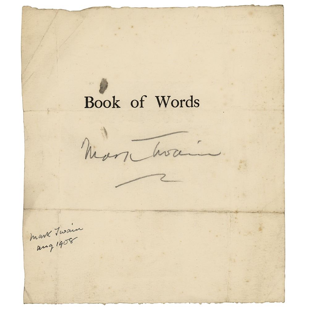 Large pencil signature, "Mark Twain,†on a 7.25 x 8.25 book page with printed text: "Book of Words." Collector's notation to the lower left dates the autograph to August 1908. In very good to fine condition, with folds, creases, and scattered light foxing.