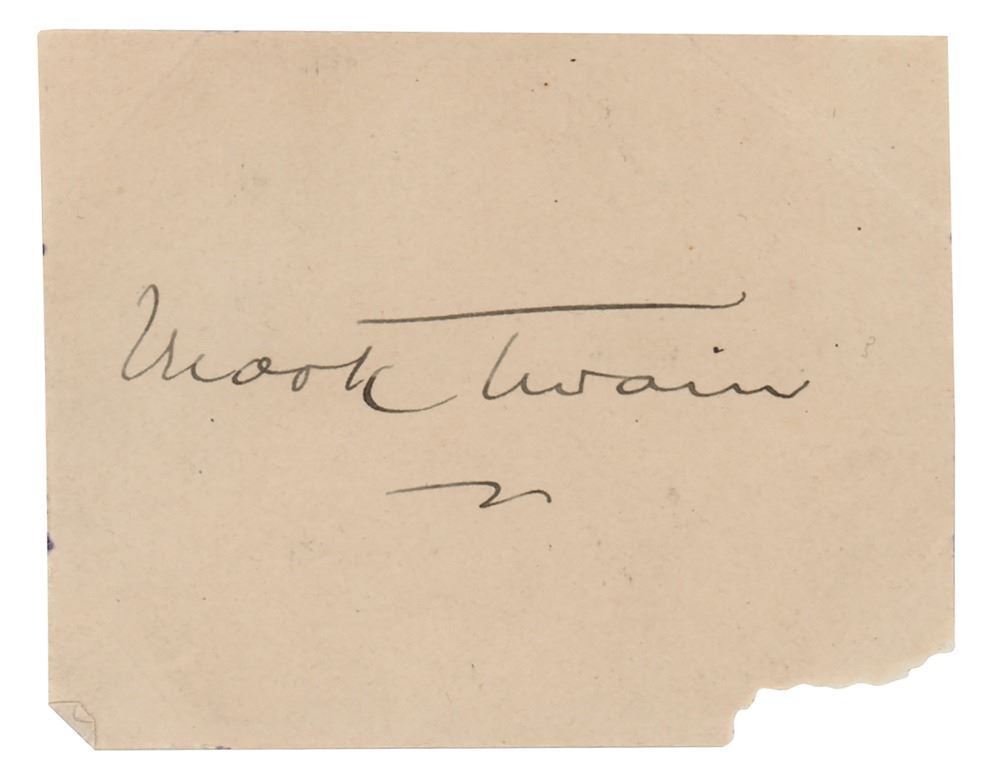 Highly desirable ink signature, "Mark Twain," on an off-white 2.75 x 2 slip. In fine condition.