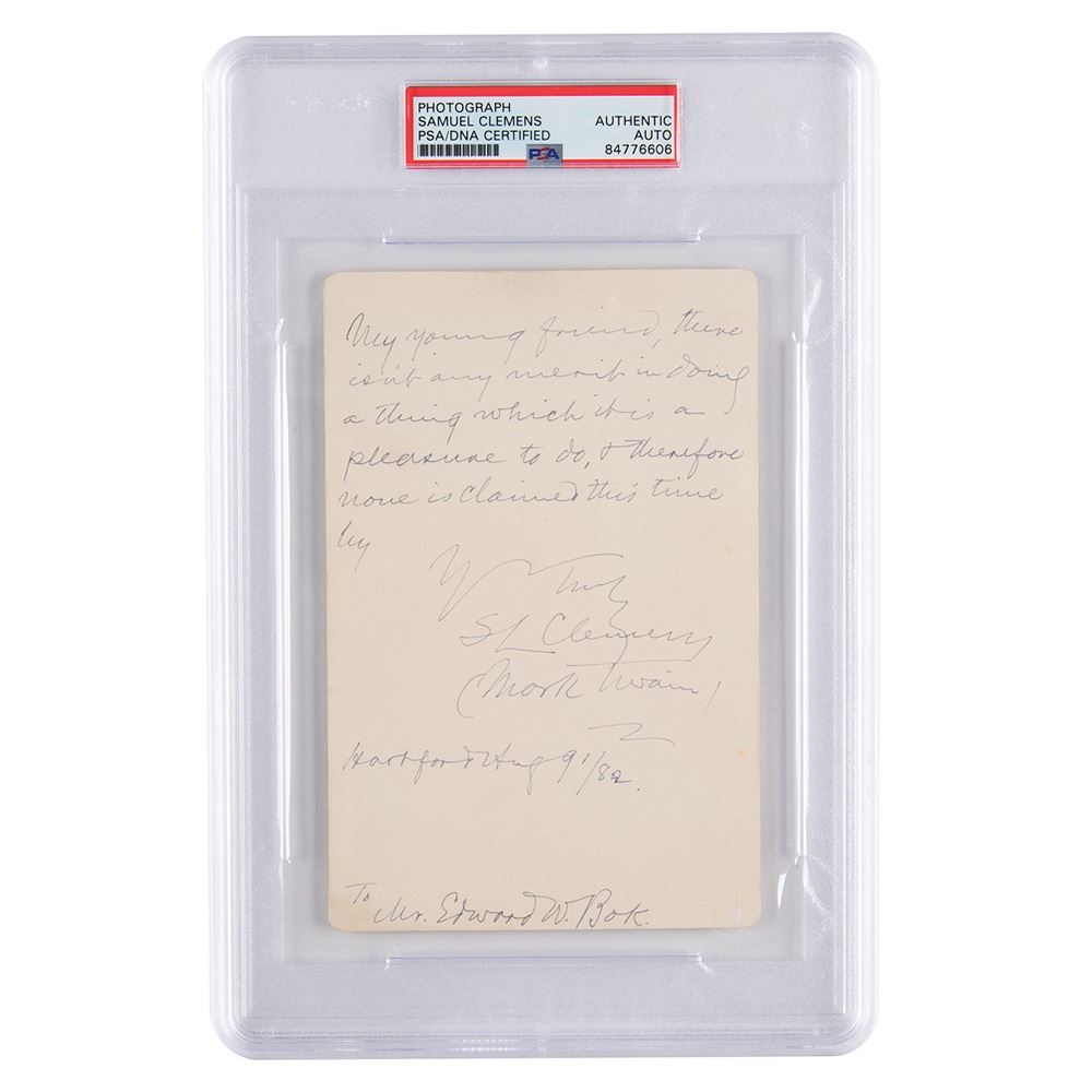 As only he could, Clemens offers his take on writing& mdash;& lsquo;there isn& #39;t any merit in doing a thing which it is a pleasure to do& rsquo;& mdash;words that must have inspired the recipient. Bok eventually made the leap to the world of publishing and was eventually the author of a 1921 Pulitzer Prize-winning autobiography. This incredible photograph, signed as both & #39;Mark Twain& #39; and & #39;Samuel L. Clemens,& #39; was the property of Bok& #39;s daughter-in-law until June 2011. A rare find with great sagacious advice from a literary master.