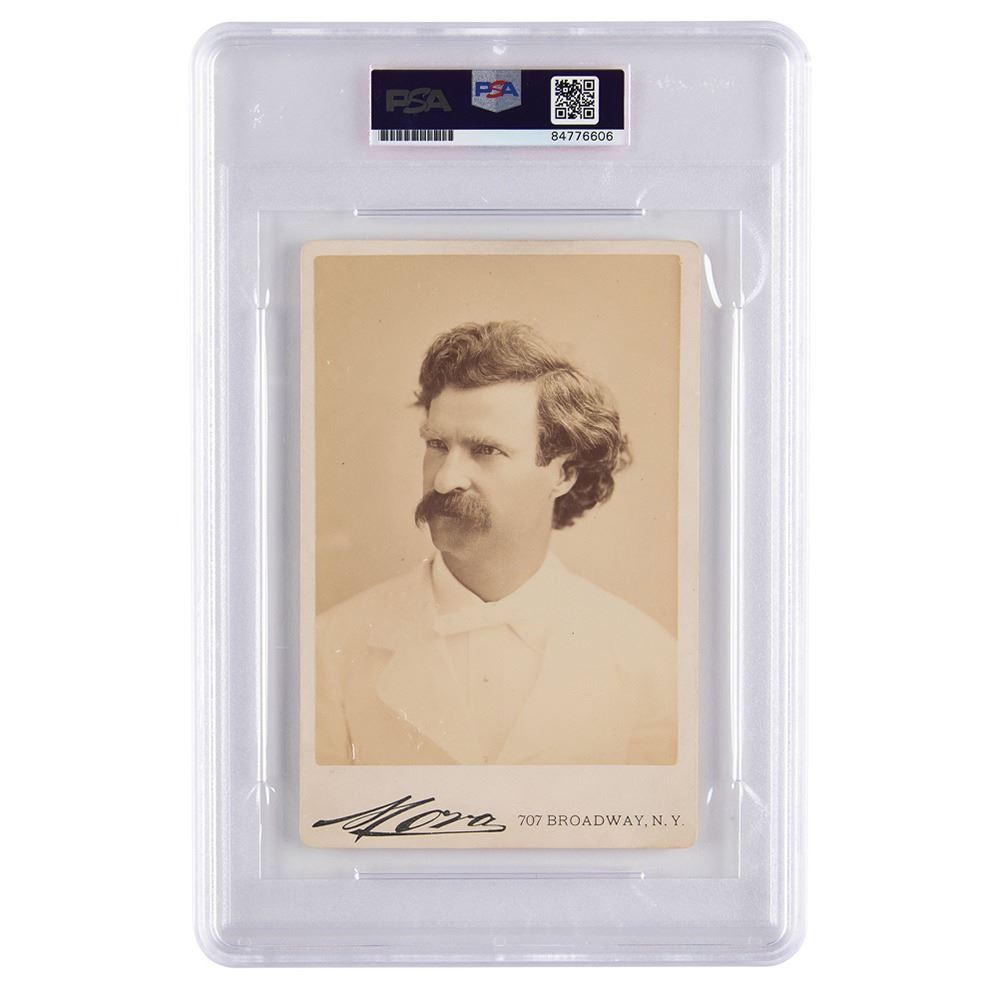 Absolutely superb 4.25 x 6.5 cabinet photo of a young Twain in his white suit by Mora of New York, signed and inscribed on the reverse in ink, "My young friend, there isn& #39;t any merit in doing a thing which it is a pleasure to do, & amp; therefore none is claimed this time by Yrs Truly, S. L. Clemens (Mark Twain) Hartford Aug. 9, 1/82. To Mr. Edward W. Bok." In fine to very fine condition. Accompanied by its seldom-seen original studio envelope, labeled "Mark Twain" by an unknown hand. Encapsulated in a PSA/DNA authentication holder.