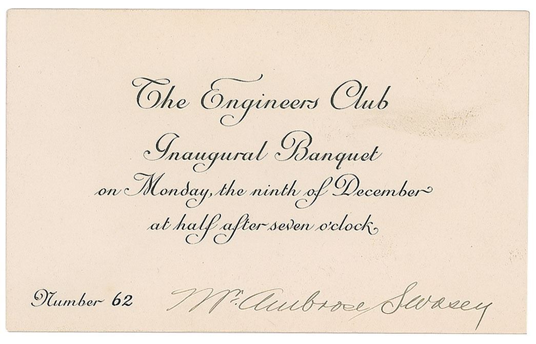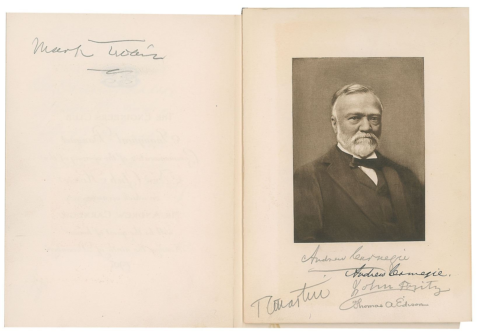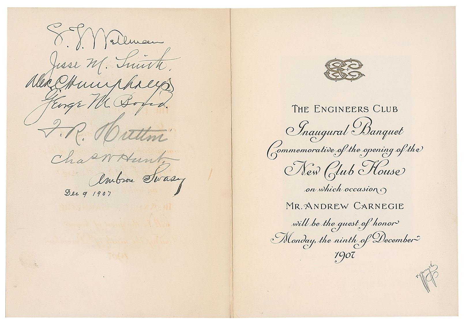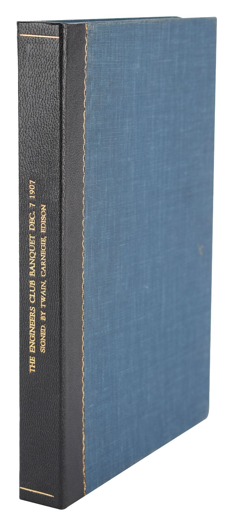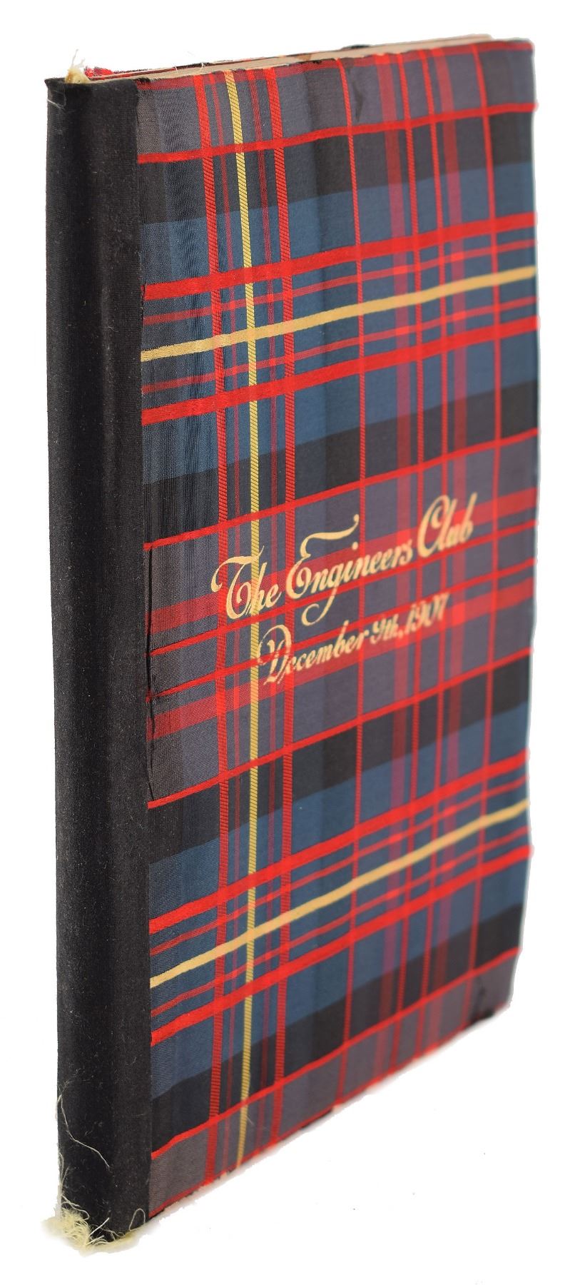 Ambrose Swasey's program for the inaugural banquet of The Engineers Club on December 9, 1907, bound in Scottish tartan silk with gilt-stamped title, 6.5 x 9, signed inside in pencil by Samuel Clemens, Thomas Edison, Andrew Carnegie, Ambrose Swasey, S. T. Wellman, Jesse M. Smith, George M. Bond, Frederick Remsen Hutton, Charles Wallace Hunt, and Alexander Crombie Humphreys. Also bears a facsimile signature of Andrew Carnegie, who was the guest of honor at the dinner, which commemorated the opening of the new club house at 32 West Fortieth Street. Engraved by Tiffany & Co. of New York, the program has been rebacked in black cloth, and contains 8 leaves and a 23-page list of members, menu, and seating plans. Opening with oysters and closing with petits fours, this gathering of American industrialists was entertained by Samuel Clemens, who has signed the volume as "Mark Twain." The author’s friend Andrew Carnegie paid for the club, and Twain roasted him gently, stating in part, 'just look at Mr. Carnegie’s face. It is all scintillating with fictitious innocence. You might think that he had never committed a crime.' In very good to fine condition. Accompanied by Swasey's engraved invitation to the event, newspaper clippings covering the occasion, and a custom-made clamshell box.