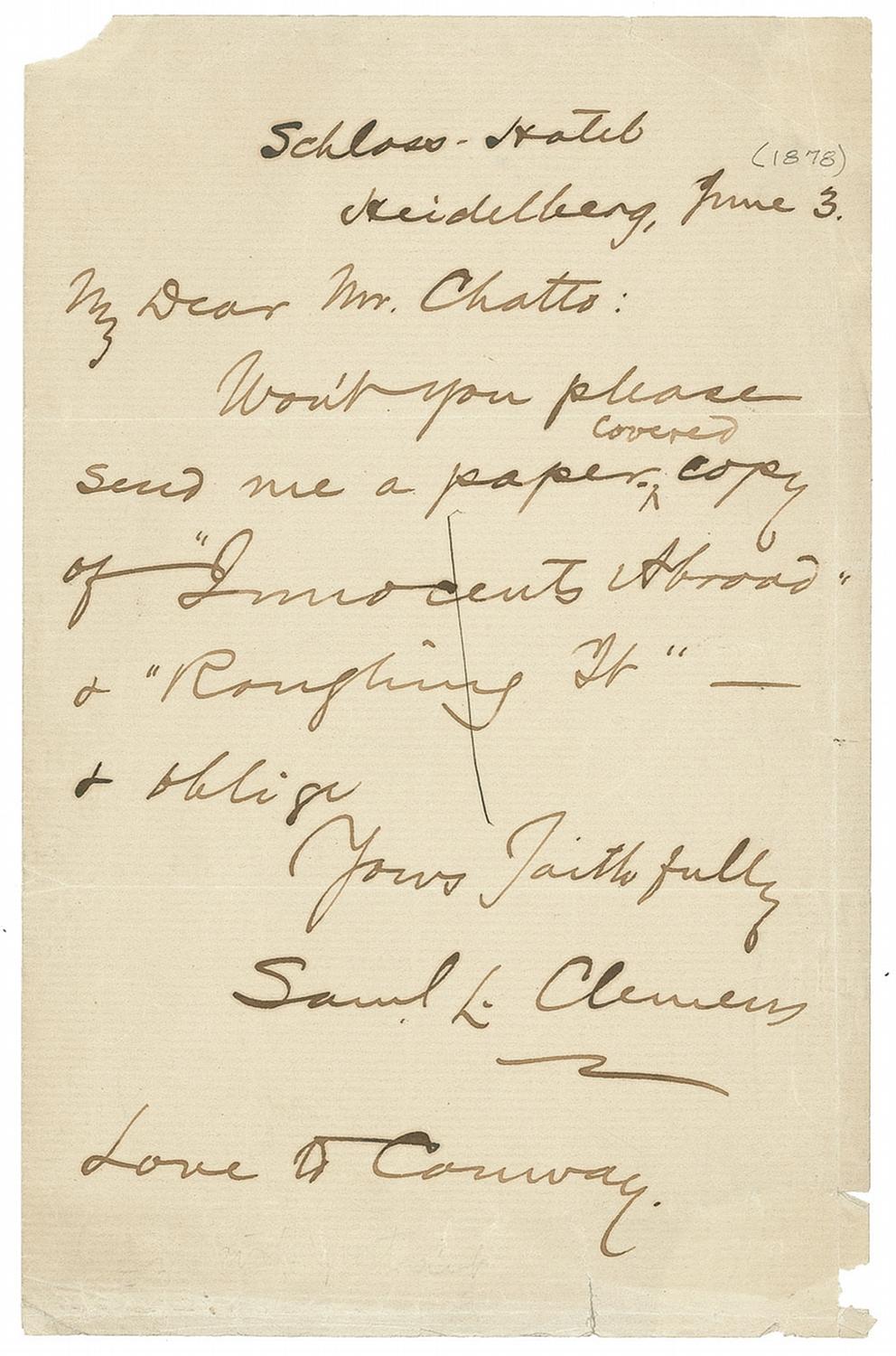 ALS signed “Saml. L. Clemens,” one page, 5.5 x 8.75, June 3. Letter to Mr. Chatto, Clemens’s English publisher. In full: “Won’t you please send me a paper covered copy of ‘Innocents Abroad’ & ‘Roughing It’ — & oblige.” In very good condition, with scattered creases and wrinkles, several edge chips, uniform light toning, and a pencil year notation of 1878.