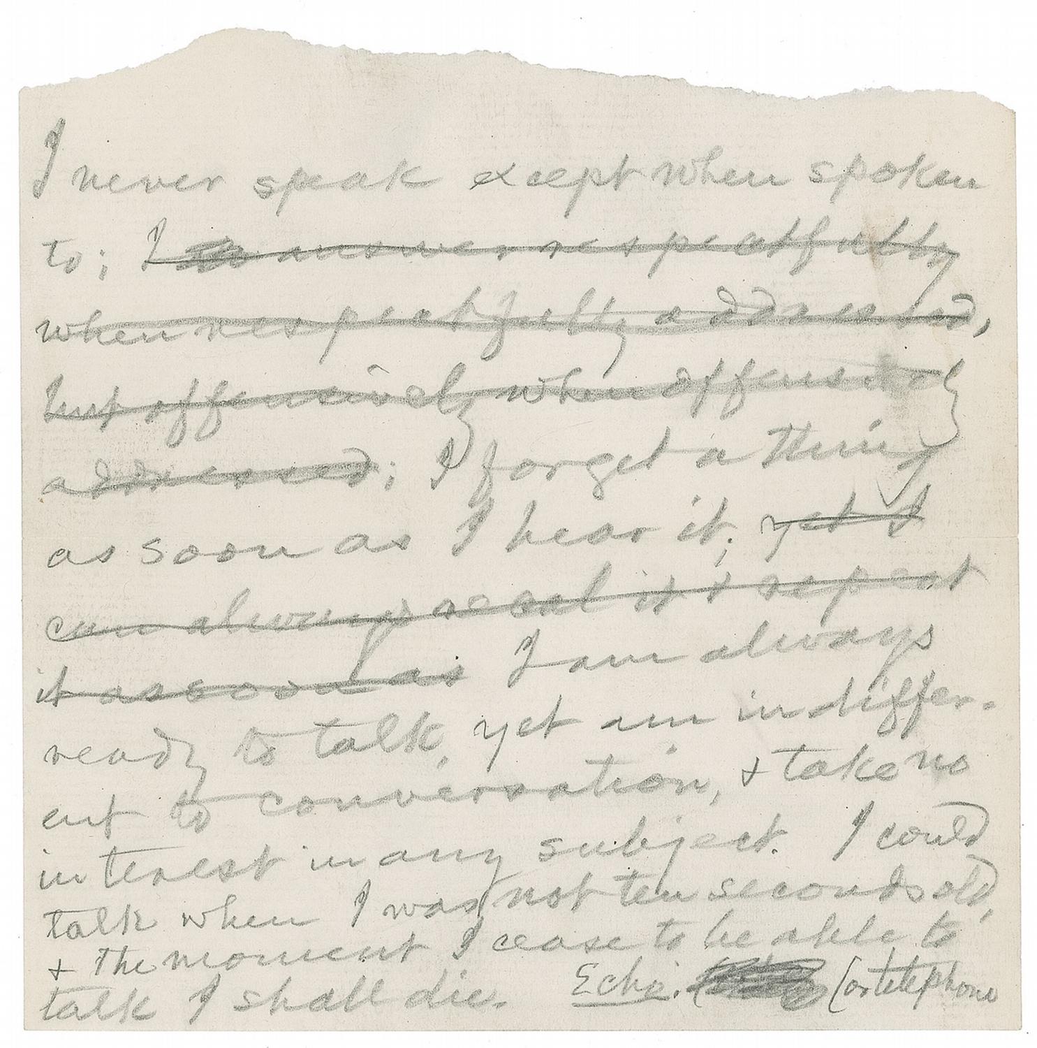 Autograph riddle, in pencil, on an off-white 5.5 x 5.25 sheet, Clemens writes, in full: “never speak except when spoken to: I answer respectfully when respectfully addressed, but offensively when offensively addressed; I forget a thing as soon as I hear it; yet I can always recal [sic] it & repeat it as soon as I am always ready to talk, yet indifferant [sic] to conversation, & take no interest in any subject. I could talk when I was not ten seconds old, & the moment I cease to be able to talk I shall die. Echo (or telephone.”
