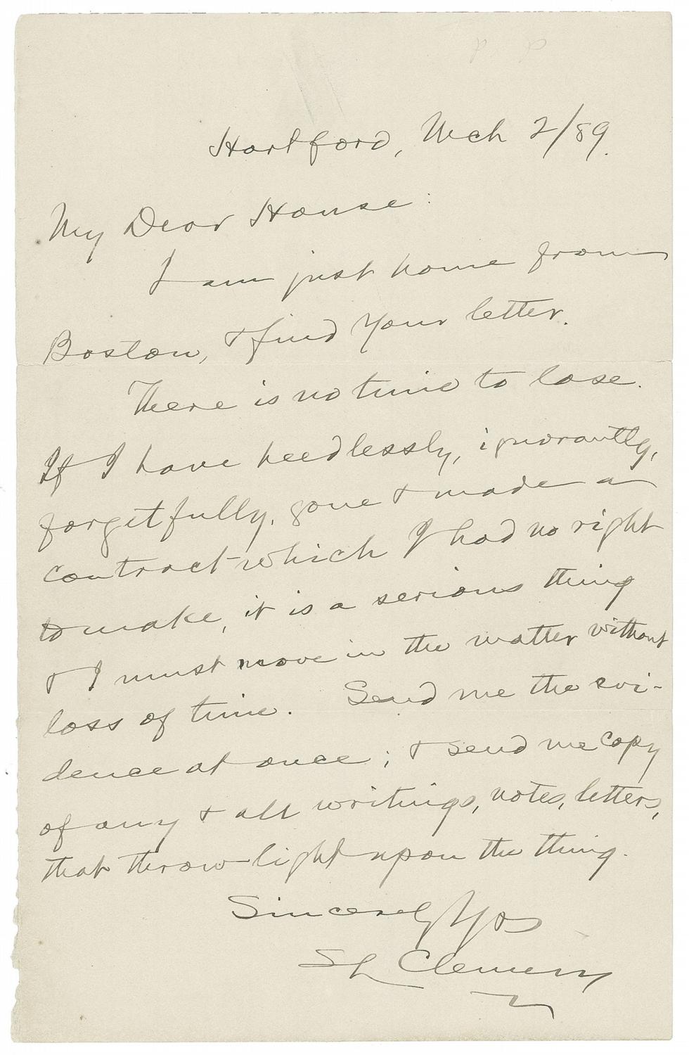 ALS signed “S. L. Clemens,” one page, 5.5 x 8.25, March 2, 1889. Letter to Edward House. In full: “I am just home from Boston, & find your letter. There is no time to lose. If I have heedlessly, ignorantly, forgetfully, gone & made a contract-which I had no right to make, it is a serious thing & I must move in the matter, without loss of time. Send me the evidence at once; & send me copy of any & all writings, notes, letters, that throw light upon the thing.” A small edge separation along on horizontal fold, a couple of paperclip impressions and pencil marks to top edge, and a few creases, otherwise fine condition.
