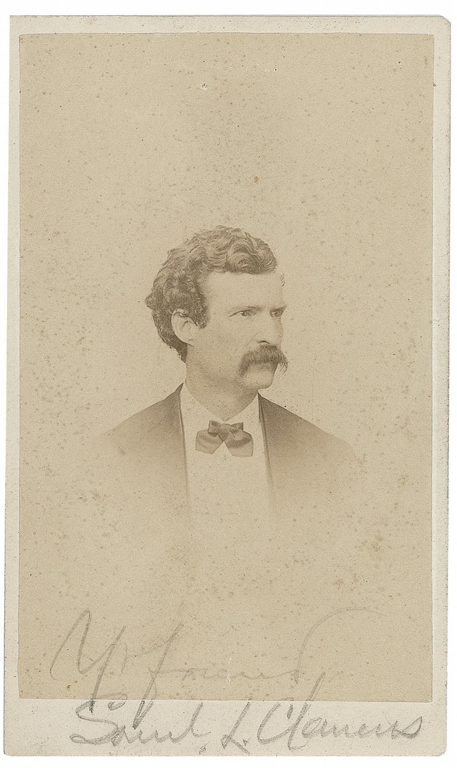 Original 2.25 x 4 carte-de-visite photo of a young Clemens, by E. P. Kellogg of Hartford, Connecticut (and so stamped on the reverse) signed in pencil on the bottom of the image and lower boder, “Yr. friend, Saml. L. Clemens.” In fine condition, with miniscule punch hole near top, a few light impressions, and a bit of scattered soiling and surface marks. Clemens is uncommon in signed photos, particularly of this era.