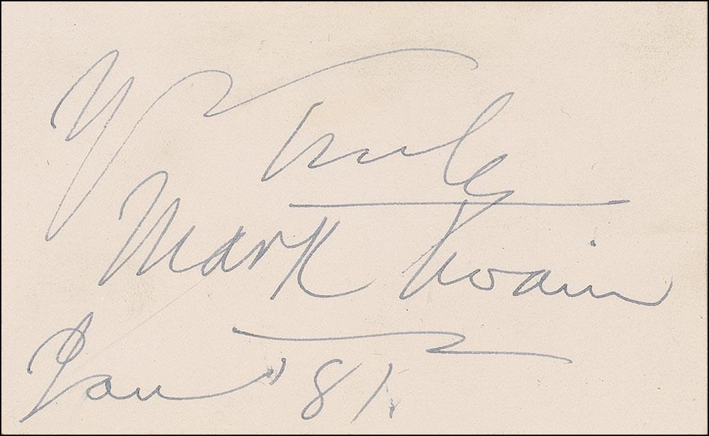 Crisp ink signature, “Yrs Truly, Mark Twain, Jan. ‘81,” on an off-white 3.5 x 2.25 card. In fine condition, a touch of scattered light soiling.