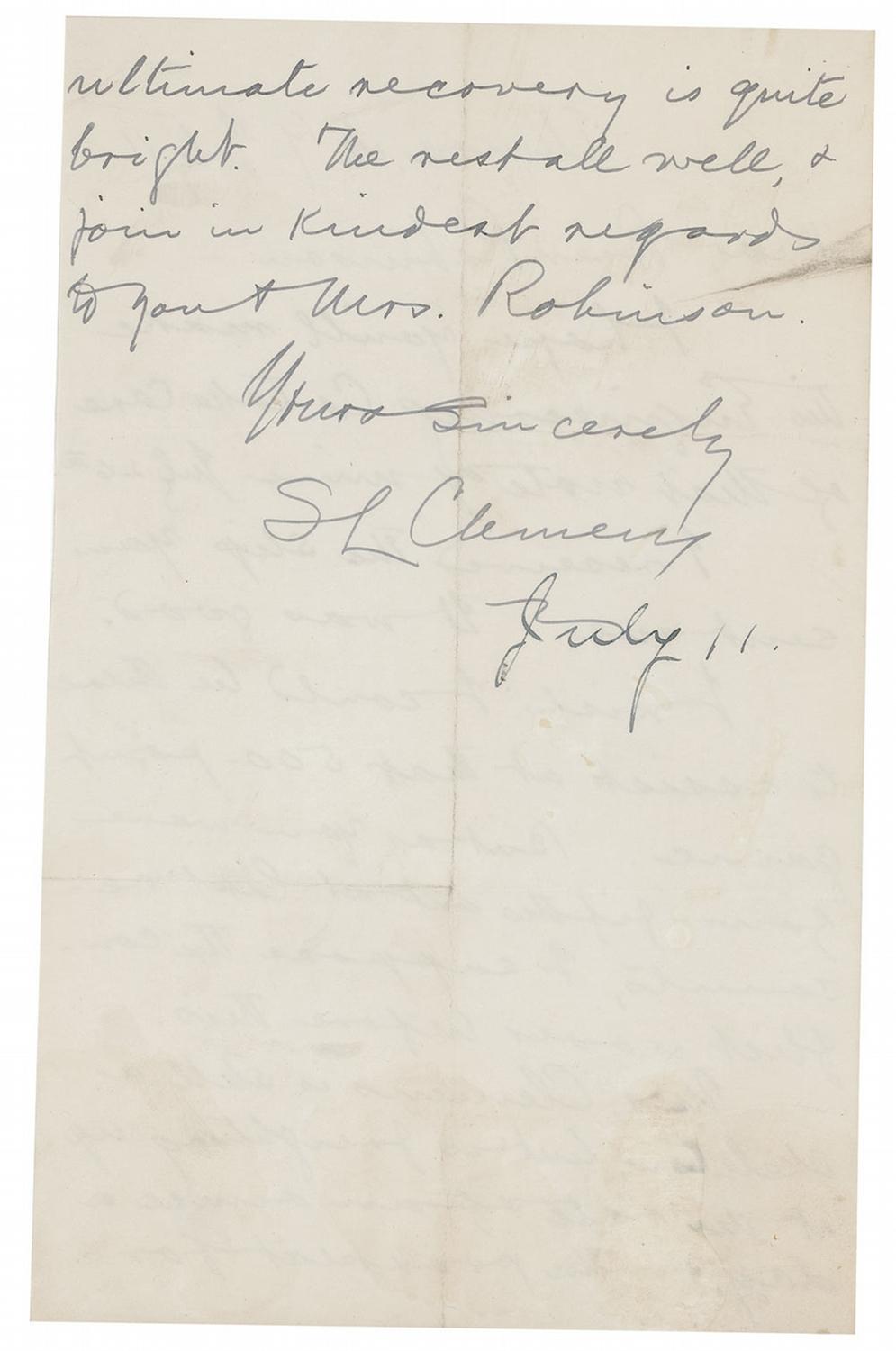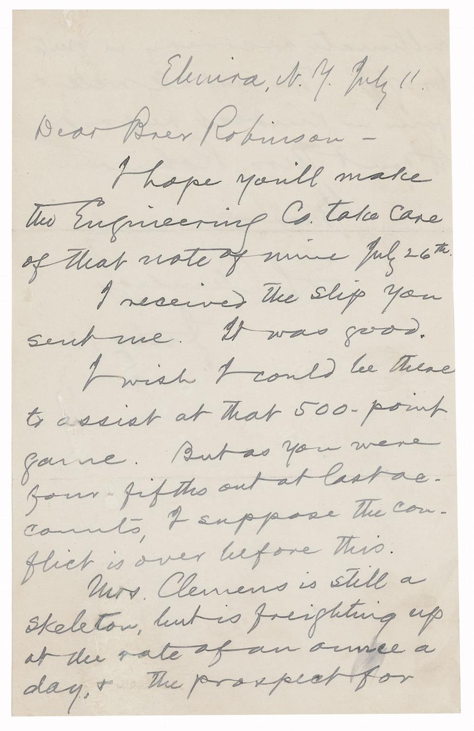 ALS signed “S. L. Clemens,” one page both sides, 5.25 x 8.5, July 11. Letter to Hartford friend and mayor, Henry ‘Brer’ Robinson. In full: “I hope you'll make the Engineering Co. take care of that note of mine July 26th. I received the slip you sent me. It was good. I wish I could be there to assist at the 500-point game. But as you were four-fifths out at last accounts, I suppose the conflict is over before this. Mrs. Clemens is still a skeleton, but is freighting up at the rate of an ounce a day, & the prospect for ultimate recovery is quite bright. The rest all well, & join in kindest regards to you & Mrs. Robinson.” In fine condition, with intersecting folds (vertical fold passing through the signature), a couple slight brushes to text, and a bit of scattered light soiling. Despite his playful jab here at his friend’s playing ability, Robinson’s 1900 death is said to have deeply affected the author, who lamented the end of the 16-year-long billiard party in which the two men partook.