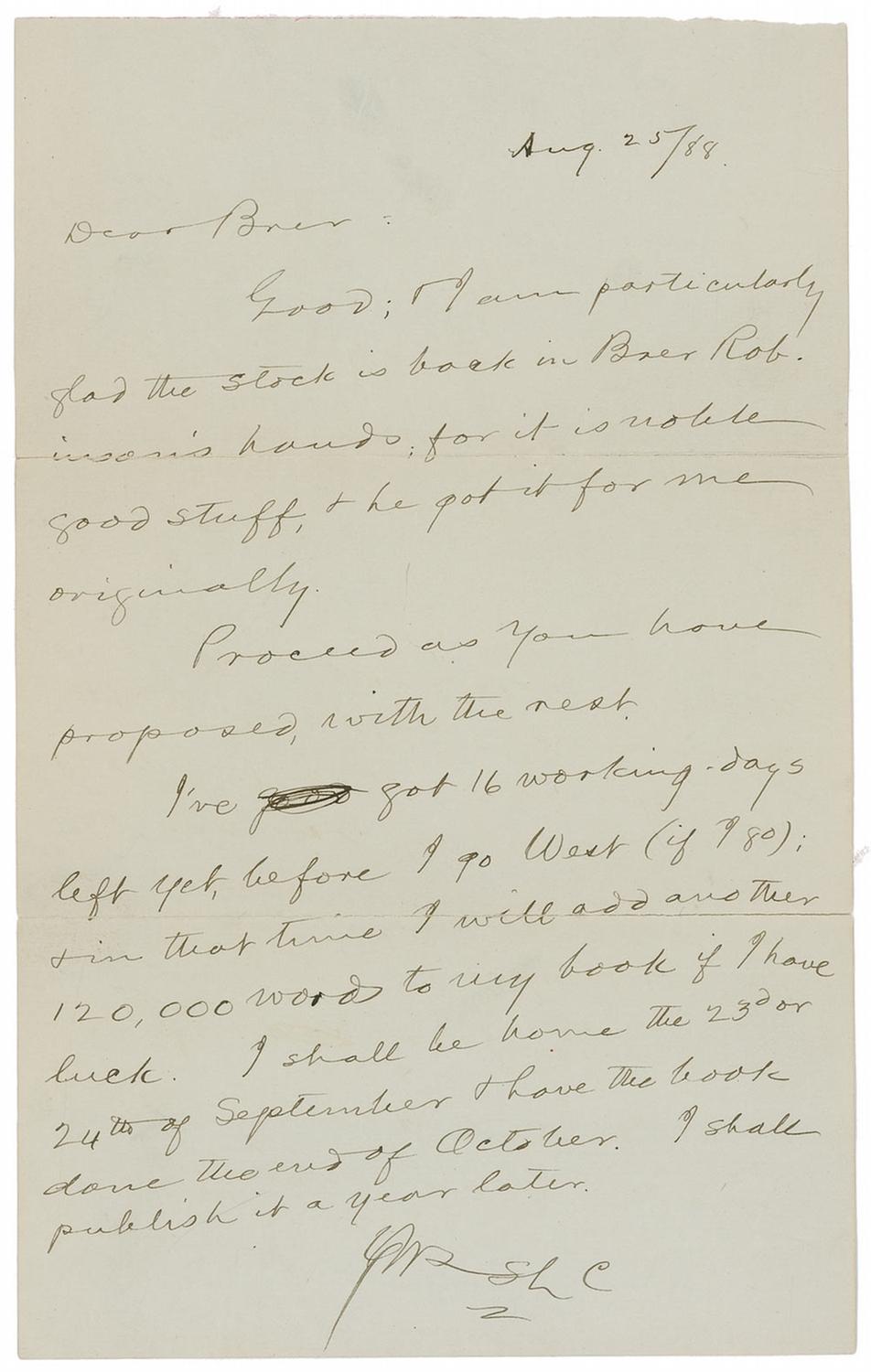 ALS signed “SLC,” one page, 5.5 x 8.75, August 25, 1888. Letter to his business agent Franklin Whitmore, referred to in the greeting as “Brer.” In full: “Good; I am particularly glad the stock is back in Brer Robinson's hands, for it is noble good stuff, & he got it for me originally. Proceed as you have proposed, with the rest. I've got 16 working days left yet, before I go West (if I go); & in that time I will add another 120,000 words to my book if I have luck. I shall be home the 23rd or 24th of September & have the book done the end of October. I shall publish it a year later.” Tape repairs on reverse to splitting along folds (bottom third of the letter appears to have been once completely detached), and a hint of mild soiling, otherwise fine condition.