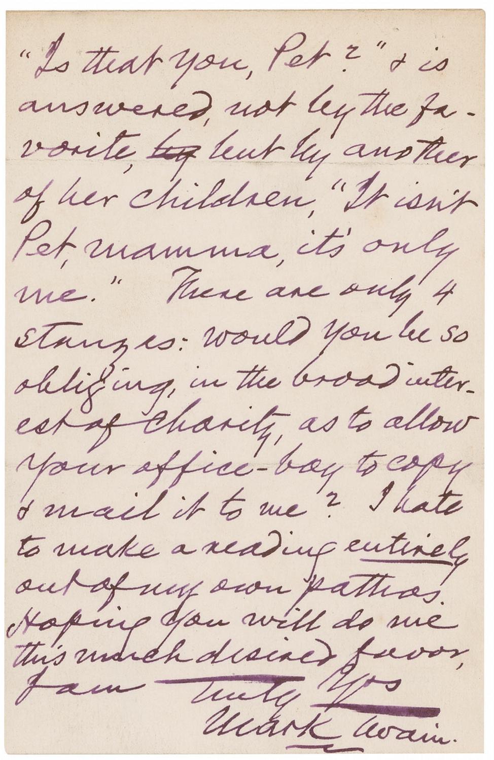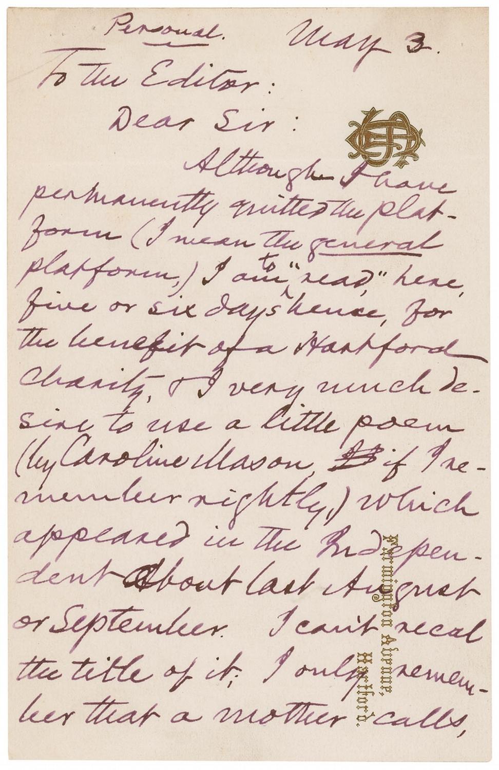 ALS signed “Mark Twain,” two pages, 4.5 x 7, written vertically on his personal embossed letterhead, May 3. Clemens sends a letter to the editor of the the New York Independent newspaper. In full: “five or six days hence, for the benefit of a Hartford Charity, & . I can’t recal [sic] the title of it; I only remember that a mother calls, ‘Is that you, Pet?’ & is answered, not by the favorite, lent by another of her children, ‘It isn’t Pet, mamma, it’s only me.’ There are only 4 stanzas; would you be so obliging, in the broad interest of charity, as to allow your office-boy to copy & mail it to me? I hate to make a reading entirely out of my own pathos. Hoping you will do me this much desired favor.” In fine condition, with some scattered soiling and staple holes to top edge. As esteemed a writer as Clemens was, he was also an incredibly heralded and famed public speaker, a vocation that didn’t hold possession of his mind and spirit the way writing did: “Although I have permanently quitted the platform (I mean the general platform,) I am to ‘read’ here.” For this particular engagement, Clemens sought the poetic musings of the four-stanza’s of the piece, ‘Favoritism,’ as he would rather have showcased the talent of another writer rather than take from his own words: “I very much desire to use a little poem (by Caroline Mason, if I remember rightly,) which appeared in the Independent about last August or September.” A wonderful request from the author of the Adventures of Huckleberry Finn to share inspirational words at one of his much acclaimed speaking engagements.