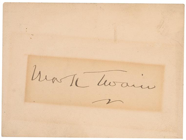 Ink signature, “Mark Twain,” on an off-white 3.5 x 2.5 card. A uniform block of toning over signature from previous display, and scattered toning and soiling to edges of card, otherwise fine condition.