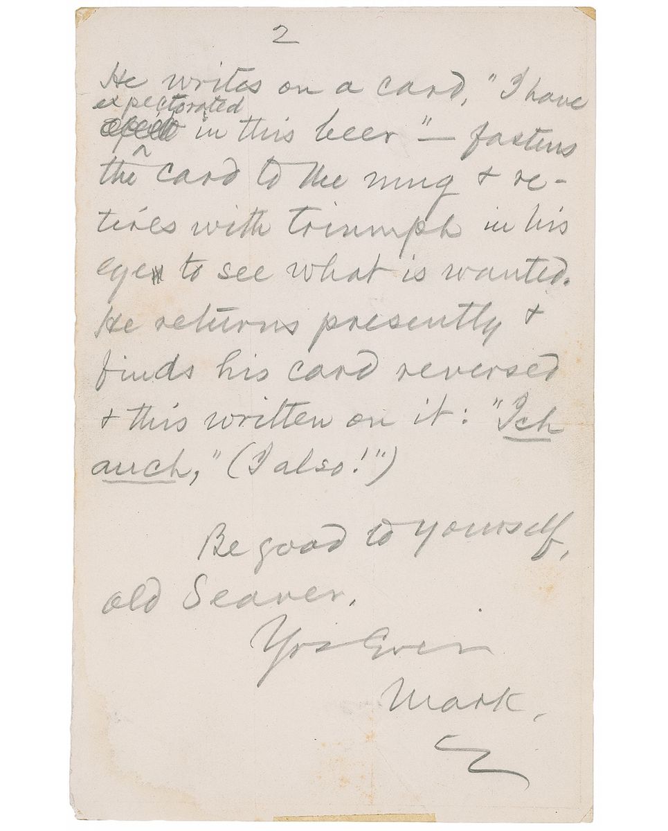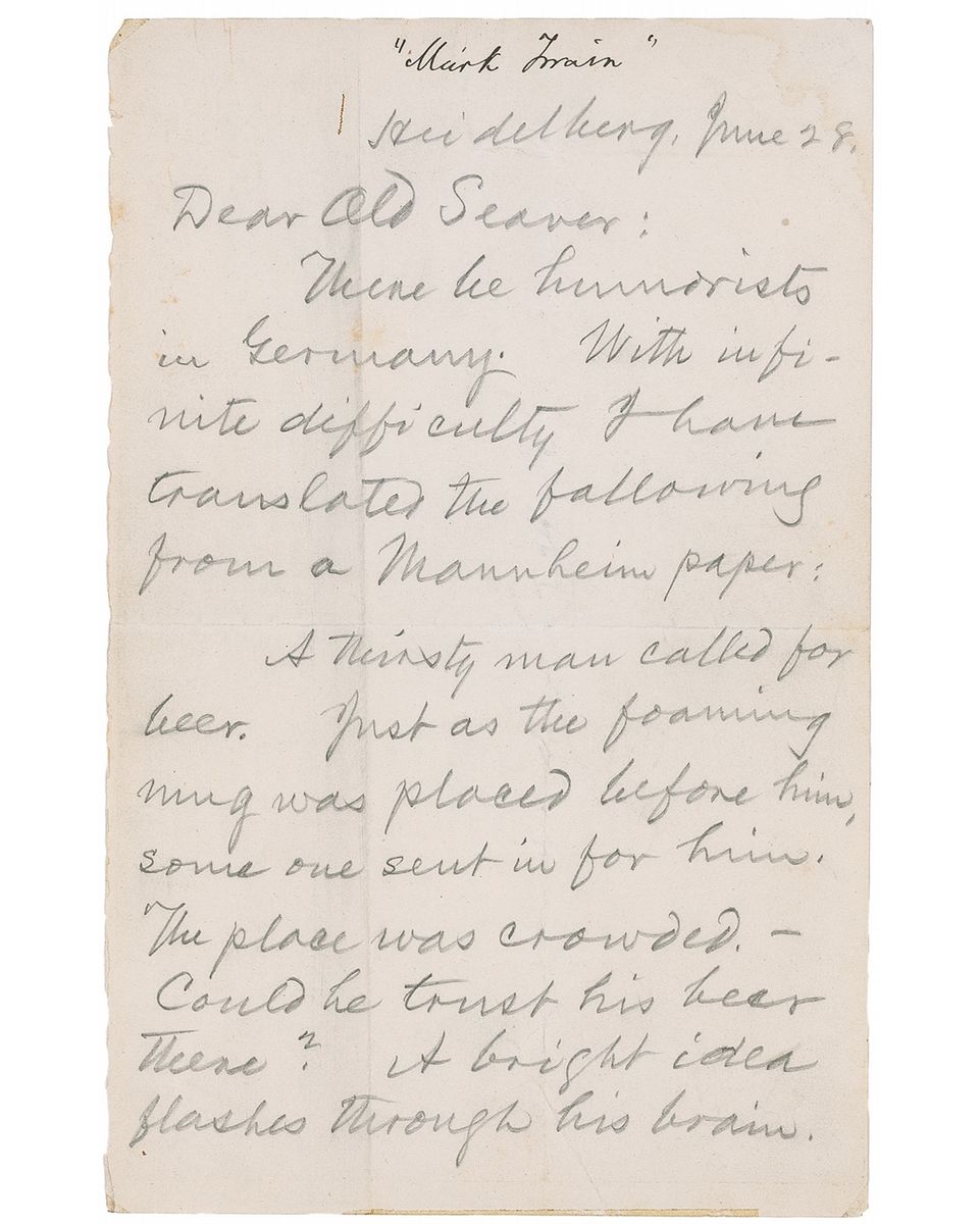 ALS, in pencil, signed “Mark,” two pages, 5 x 7.75, June 28. Letter, written from Heidelberg, Germany, to author William Seaver. In full: “There be humorists in Germany. With infinite difficulty I have translated the following from a Mannheim paper: A thirsty man called for beer. Just as the foaming mug was placed before him, some one sent in for him. The place was crowded.—Could he trust his beer there? A bright idea flashes through his brain. He writes on a card, ‘I have expectorated in this beer’—fastens the card to the mug & retires with triumph in his eye to see what is wanted. He returns presently & finds his card reversed & this written on it: ‘Ich auch,’ (’I also!’) Be good to yourself, old Seaver.” In very good condition, with intersecting folds, scattered creasing and soiling, some dampstaining to second page, small tape remants to bottom of each page, and an ink notation to top of first page. Twain and his family were in Heidelberg in 1878, where he was collecting material that would be published in A Tramp Abroad in 1880. William Seaver was a friend of Clemens' and a writer for Harper's Bazaar and Harper's Weekly during the 1870s.