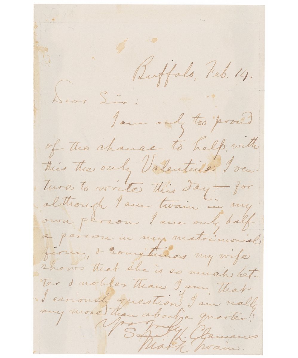 ALS signed “Samuel L. Clemens, Mark Twain,” one page, lightly-lined, 4.5 x 7, February 14 [1871]. Letter to an unidentified gentleman. In full: “I am only too proud of the chance to help with this the only Valentine I venture to write this day—for although I am twain in my own person I am only half a person in my matrimonial firm, & sometimes my wife shows that she is so much better & nobler than I am that I seriously question I am really any more than about a quarter!” In very good condition, with scattered light staining to letter, not affecting legibility, and mounting remnants to reverse.