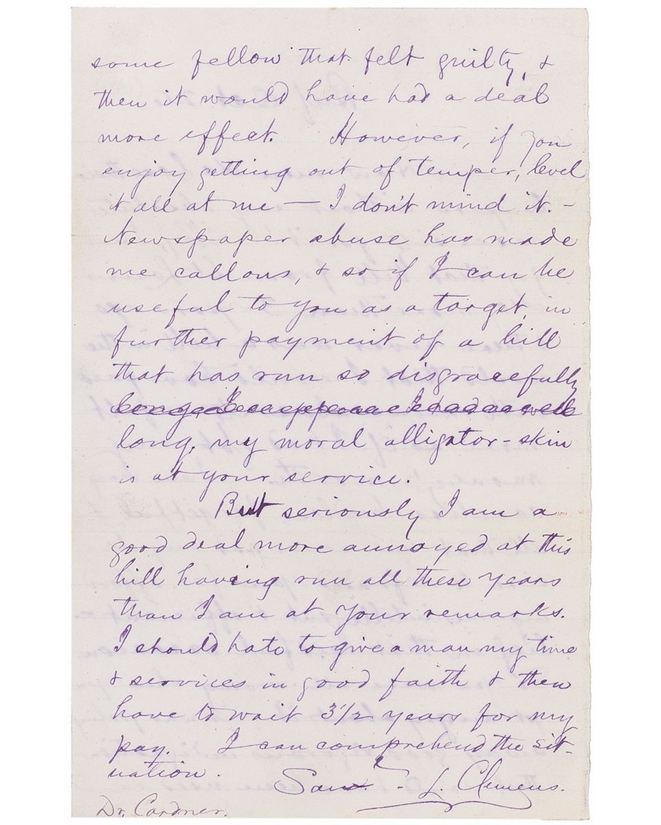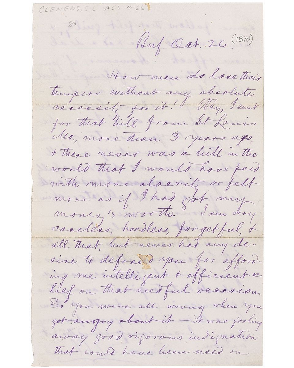 ALS signed “Sam’l L. Clemens,” one page, lightly-lined both sides, 5 x 7.75, October 26, 1870. Letter to Dr. Cardener. In full: “How men do lose their tempers without any absolute necessity for it! Why, I send for that bill for St. Louis Mo., more than 3 years ago, & there never was a bill in the world that I would have paid with more alacrity or felt more as if I had got my money's worth. I am very careless, heedless, forgetful, & all that, but never had any desire to defraud you from affording me intelligent & efficient relief on that needful occasion. So you were all wrong when you got angry about it—it was fooling away good vigorous indignation that could have been used on some fellow that felt guilty, & then it would have had a deal more effect. However, if you enjoy getting out of temper, level it all at me—I don't mind it. Newspaper abuse has made me callous, & so if I can be useful to you as a target, in further payment of a bill that has run so disgracefully long, my moral alligator-skin is at your service. But seriously I am a good deal more annoyed at this bill having run all these years than I am at your remarks. I should hate to give a man my time & services in good faith & then have to wait 3 1/2 years for my pay. I can comprehend the situation.” A couple pencil notations to top, some light toning along folds on front of letter, and a small spot to one word of text, otherwise fine condition. A very direct and poignant letter from the perturbed Clemens.