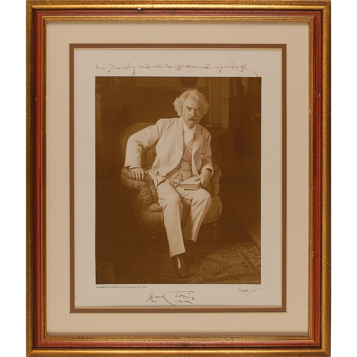 Vintage matte-finish 10 x 12.25 Underwood and Underwood portrait of Clemens, clad in his trademark white suit, a book on his lap, signed and inscribed in fountain pen in the large white border “Mrs. John Wayland, with the affectionate regards of Mark Twain. Sept/08.” Double-matted and framed to an overall size of 14.75 x 17. In fine condition. One of the finest portraits we have offered boasting an exceptionally clean and bright image and signature.