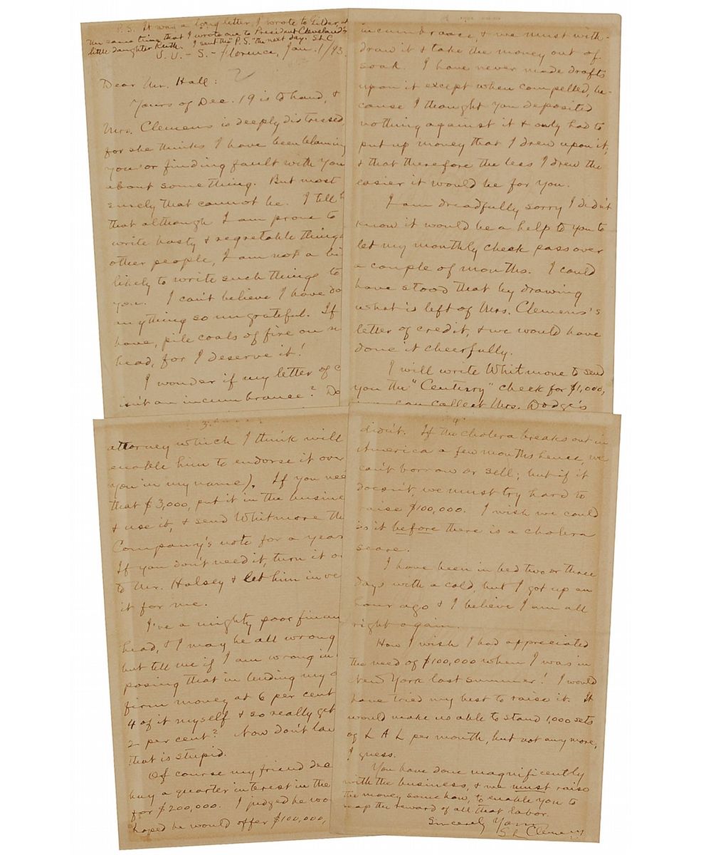 ALS signed “S. L. Clemens,” four pages, 5 x 8, Florence, Italy, January 1, 1893. Letter to Frederick J. Hall. In full: “Ours of Dec. 19 is to hand, & Mrs. Clemens is deeply distressed, for she thinks I have been blaming you or finding fault with you about something. But most surely that cannot be. I tell her that although I am prone to write hasty & regretable things to other people, I am not a bit likely to write such things to you. I can't believe I have done anything so ungrateful. If I have, pile coals of fire on my head, for I deserve it!
