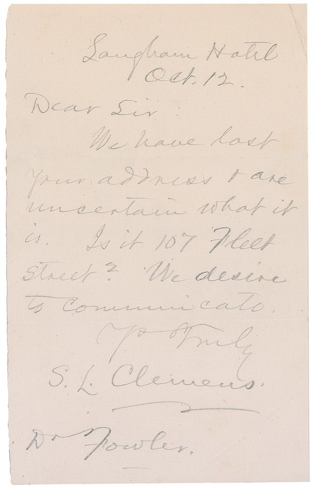 ALS, in pencil, signed “S. L. Clemens,” one page, 4.25 x 7, October 12. From the Langham Hotel, Clemens writes to Dr. Fowler. In full: “We have lost your address & are uncertain what it is. Is it 107 Fleet Street? We desire to communicate.” In fine condition, with a few creases and some scattered wrinkling. Clemens was in London staying at the Langham Hotel in 1872–1873. He encountered Lorenzo Fowler's advertisement for his office on Fleet Street in that city. Lorenzo and his wife had had a successful lecture tour of England, and they had settled down in London where they had opened their phrenological office. Clemens wrote of his visit that Fowler found a spot on his skull that ‘represented the total absence of the sense of humor.’