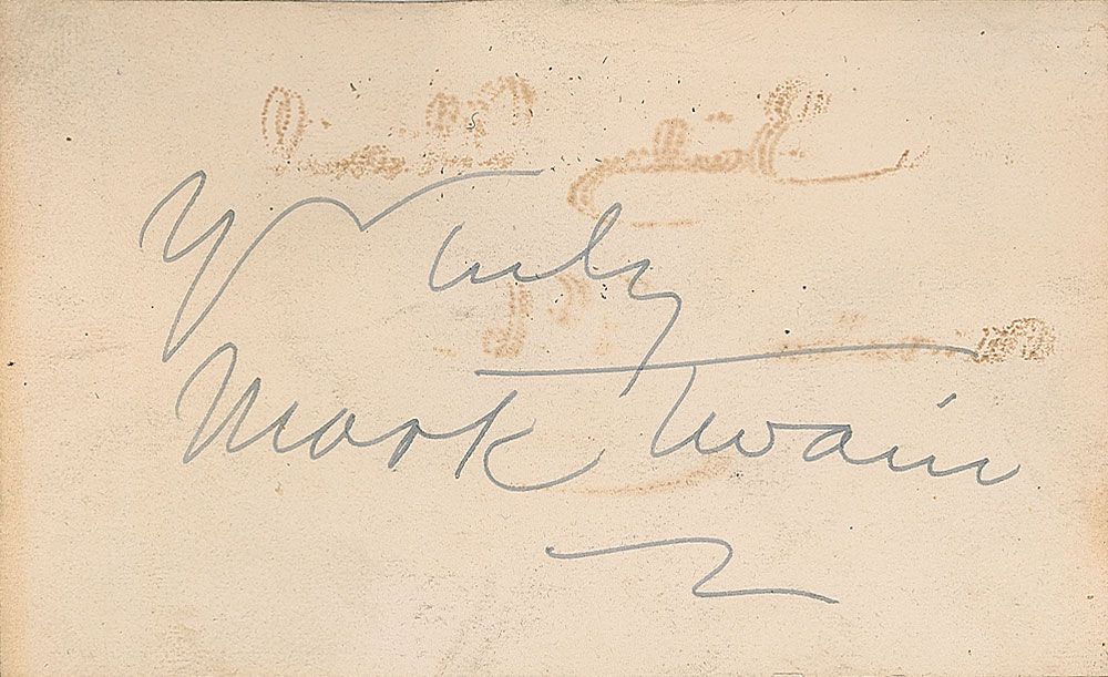 Ink signature, “Yrs truly, Mark Twain,” on an off-white 3.75 x 2.25 card. In very good condition, with scattered toning and soiling, mirroring of other ink over sentiment, mild bends and ripples, and mounting remnants to reverse from previous display in a