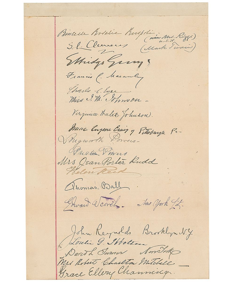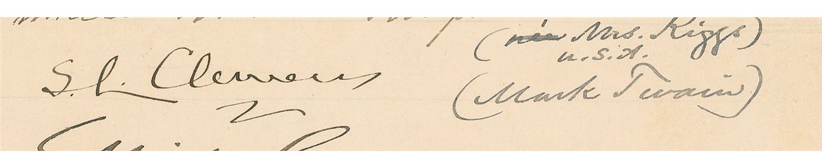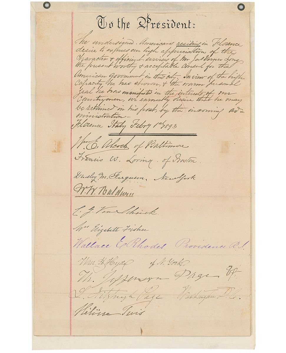 Manuscript DS, signed “S. L. Clemens,” two pages both sides, 8.75 x 13.25, February 1, 1893. Petition presented to soon-to-be President Grover Cleveland reads, “The undersigned Americans residing in Florence desire to express our high appreciation of the