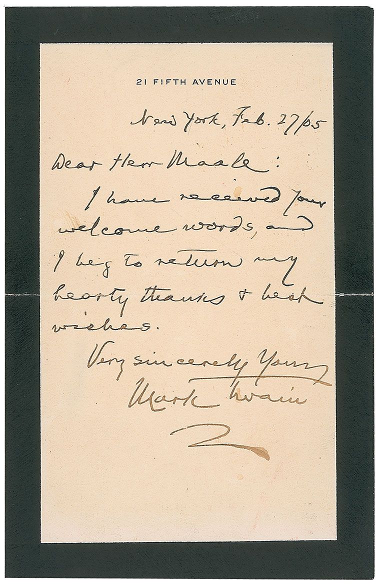ALS signed “Mark Twain,” one page, 4 x 6, black-bordered personal letterhead, February 27, 1905. Letter to Herr Richard Maale. In full: “I have received your welcome words, and I beg to return my hearty thanks & best wishes.” A small separation along the