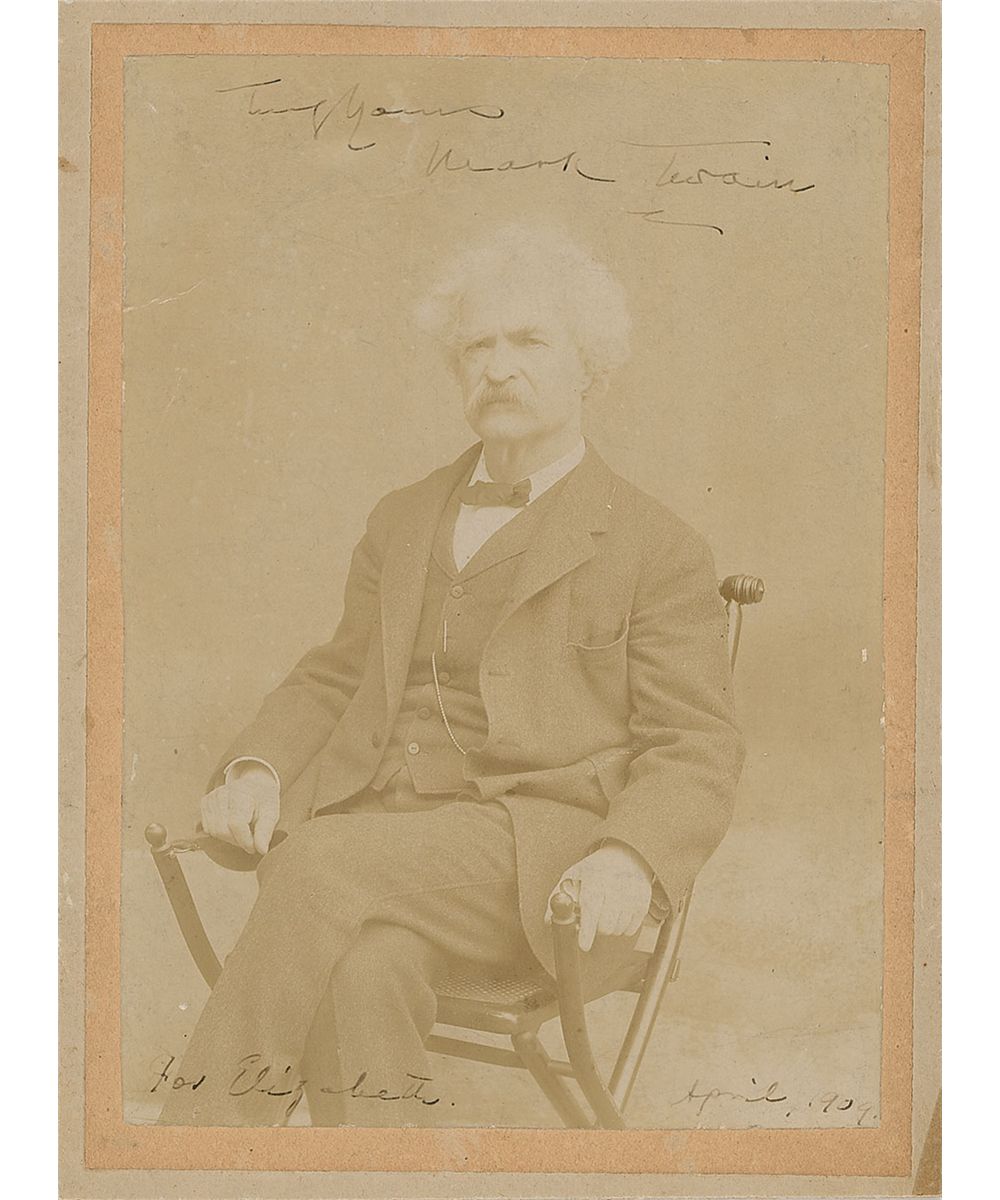 Vintage 4.5 x 6.5 photo of Clemens in a wooden chair, affixed to a 5 x 7 mount, in turn affixed to a slightly larger card, signed and inscribed in black ink “Truly yours, Mark Twain, For Elizabeth, April 1909.” In very good condition, with scattered creases and surface impressions, signature and inscription a shade or two light, and mild-to-moderate fading to image.