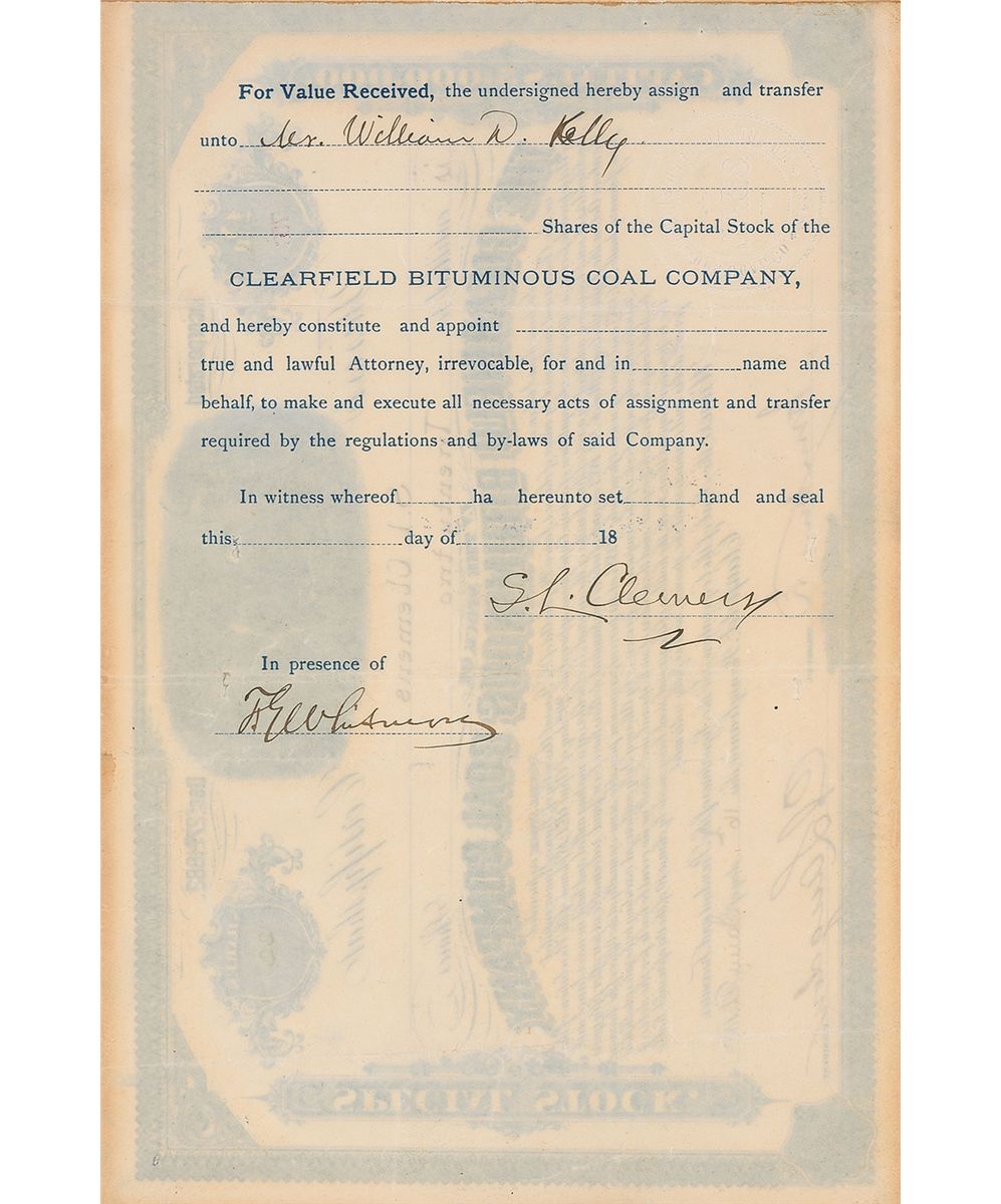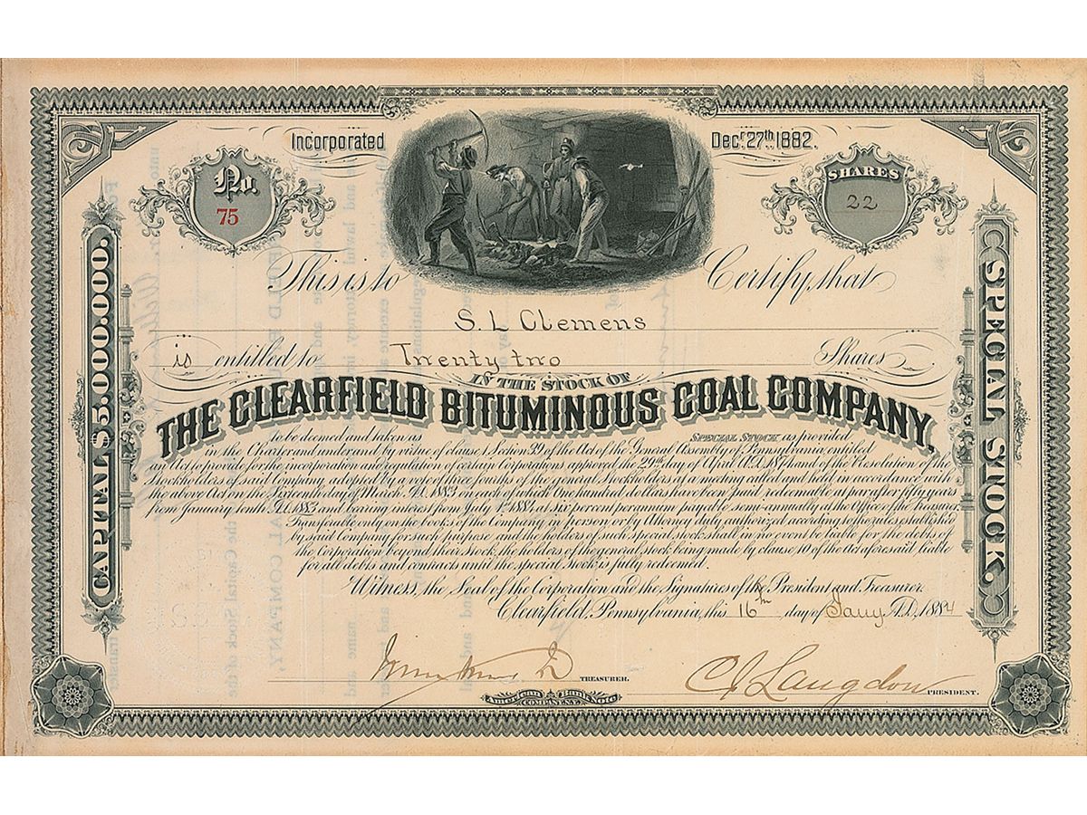 Ornate partly-printed DS, signed “S. L. Clemens,” one page both sides, 10.75 x 7, January 16, 1884. Stock certificate for 22 shares of The Clearfield Bituminous Coal Company issued to Clemens. Signed at the bottom by President C. L. Langdon, and signed on the reverse by Clemens, transferring the stock to William D. Kelly. Several vertical folds, some mild light toning, and the receipt affixed to left edge, otherwise fine condition. Accompanied by two thick ledgers of issued stock certificates.
