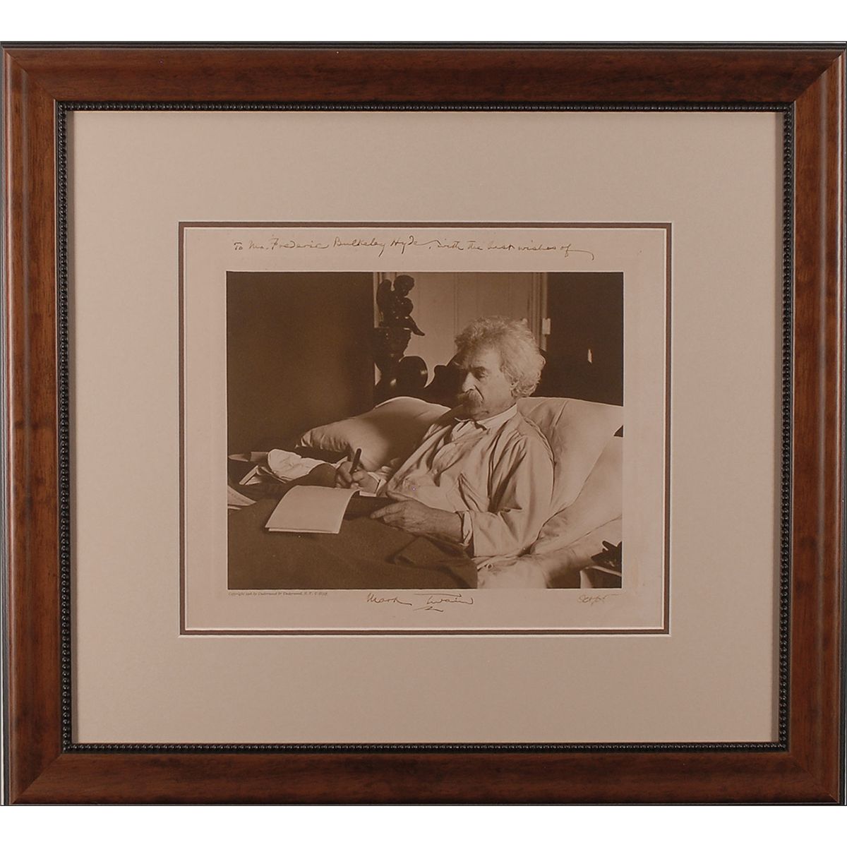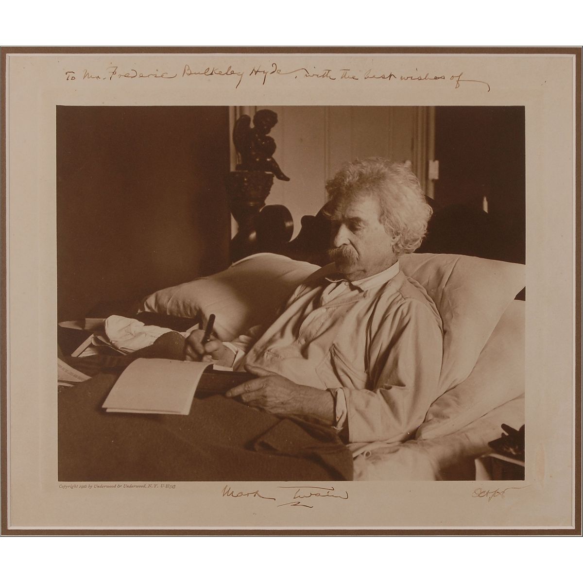Superb matte-finish 12 x 10 Underwood & Underwood portrait of Twain writing in his notebook, signed and inscribed in the borders in black ink, “To Mr. Frederic Bulkeley Hyde, with the best wishes of Mark Twain, Oct. ’08.” Beautifully double-matted and framed to an overall size of 21.5 x 19.5. In fine condition, with a crease to the upper border (slightly affecting inscription) and a small area of discoloration to the right border. Hyde was a photographer who took numerous portraits of Twain in 1908; other notable individuals to be photographed by Hyde include Theodore Roosevelt, William Howard Taft, and Andrew Carnegie. A truly spectacular portrait of Clemens in a literary pose.