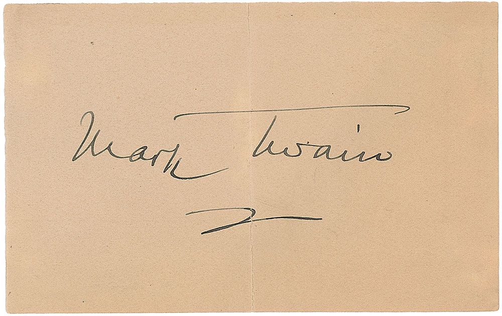 Large ink signature, “Mark Twain,” on an off-white 4.75 x 2.75 sheet. In fine condition, with partial separation to bottom of central vertical fold, and some light show-through from mounting remnants on reverse.