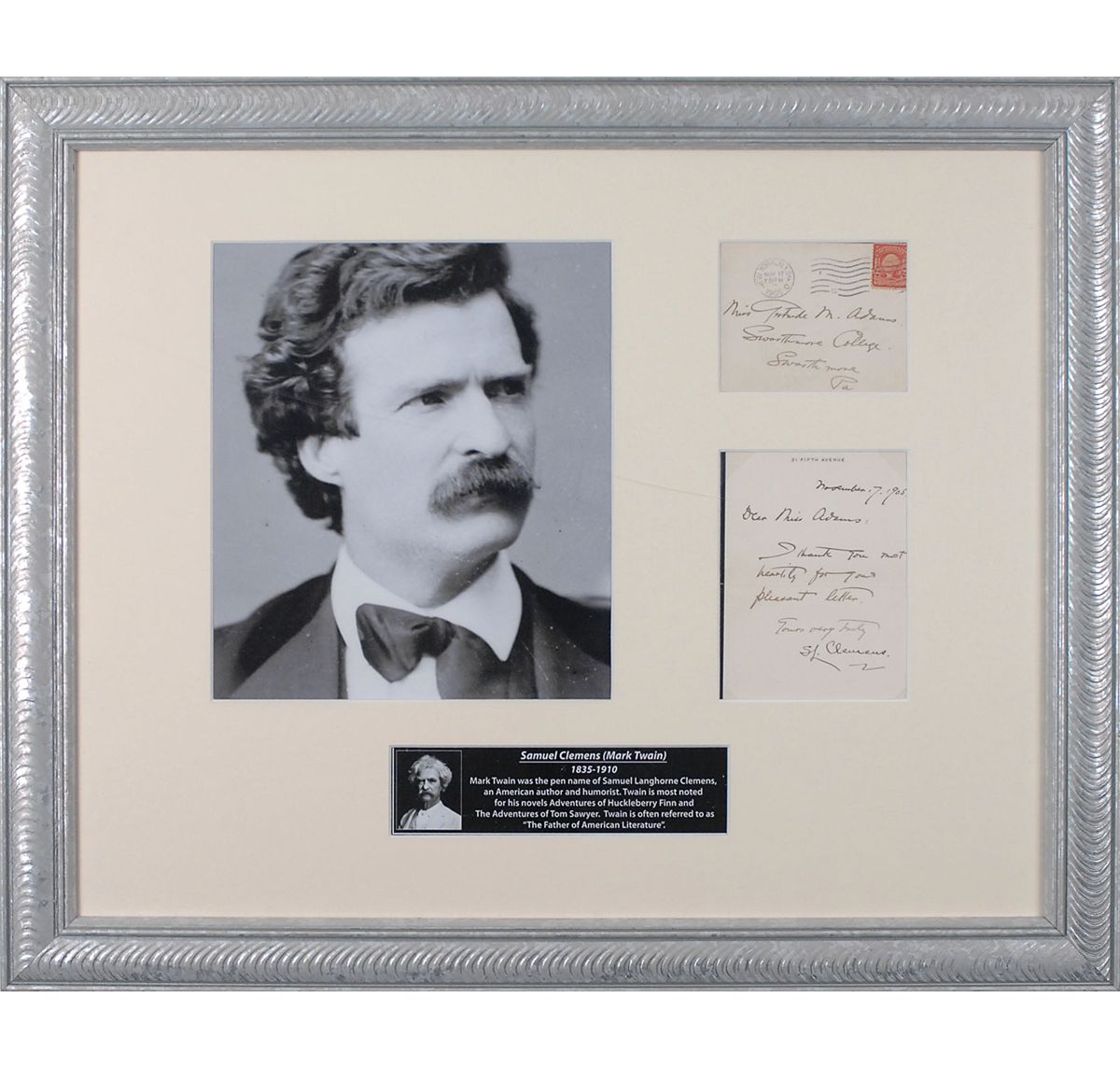ALS signed “S. L. Clemens,” one page, 3.75 x 5, personal letterhead, November 17, 1905. Letter to Gertrude Adams of Swarthmore. In full: “I thank you most heartily for your pleasant letter.” Also includes the original mailing envelope, filled out in Clemens’s hand. Both are matted and framed with an unsigned photo and biographical plaque to an overall size of 22.5 x 18.5. In fine condition, with a long surface mark to the frame’s plexiglass. Accompanied by a full letter of authenticity from JSA.