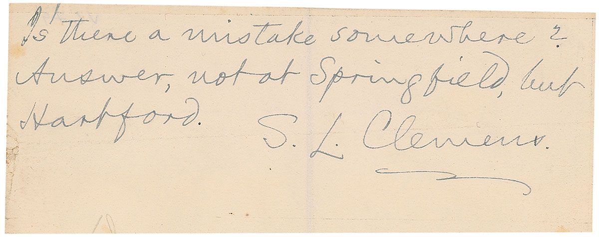 Partial self-contained ANS signed “S. L. Clemens,” one page, 5.5 x 2.25, no date. Conclusion of a longer letter reads, “Is there a mistake somewhere? Answer, not at Springfield, but Hartford.” Top portion of the note is affixed to a slightly larger off-white card. In fine condition, with light intersecting folds, two lightly passing through portions of signature.