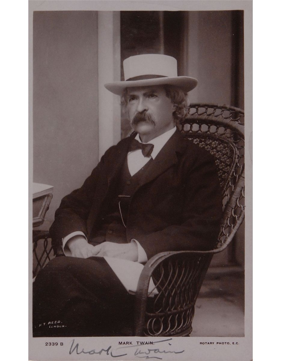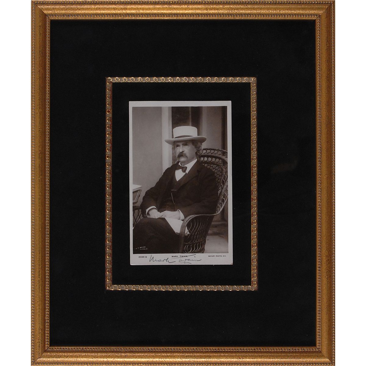 Vintage glossy 3.25 x 5.25 photo of Clemens seated on a porch in a white hat, a folded paper in his lap, signed in black ink. Suede-matted and framed to an overall size of 10 x 12. In fine condition, with a small crease along top border.