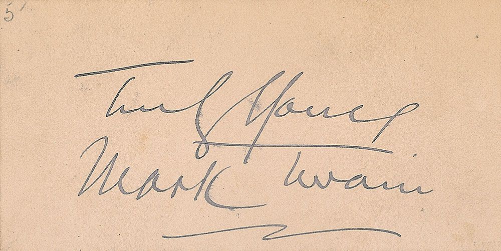 Ink signature, “Truly yours, Mark Twain,” on an off-white 3.75 x 2 card. Card is affixed to a slightly larger off-white slip. In fine condition, with some scattered mild soiling, not detracting from the bold signature.