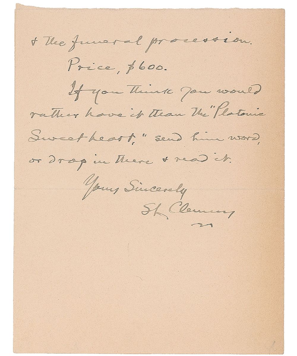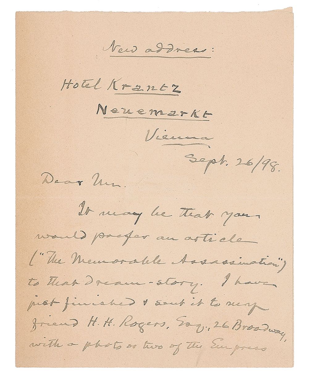 ALS signed “SL Clemens,” two pages on adjoining sheets, 4.5 x 5.75, September 26, 1898. Letter to Edward W. Bok, publisher of the Ladies’ Home Journal. In full: “New address: Hotel Krantz Neuemarkt Vienna…It may be that you would prefer an article (‘The Memorable Assassination’) to that dream-story. I have just finished & sent it to my friend H.H. Rogers, Esq., 26 Broadway, with a photo or two of the Empress & the funeral procession. Price, $600. If you think you would rather have it than the ‘Platonic Sweetheart,’ send him word, or drop in there & read it.” In fine condition, with a tiny tear where the recipient’s name has been rubbed off, mild toning, a bit heavier to edges, and a slightly trimmed top edge. My Platonic Sweetheart wasn’t published until December 1912, two years after he died. The Memorable Assassination was never published in any magazine. It was included in What Is Man? And Other Essays by Clemens, published by Harper & Brothers in 1917.