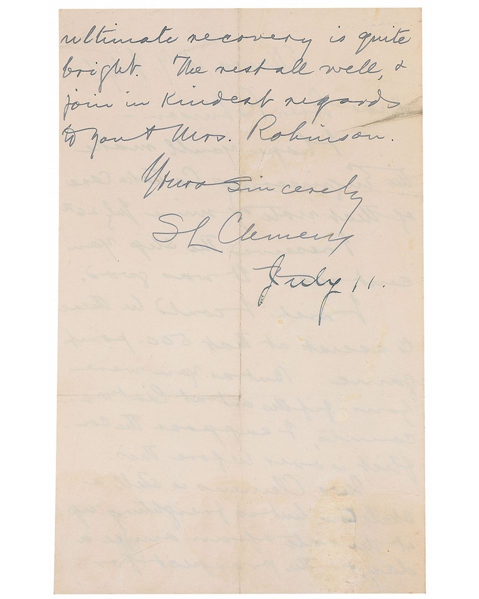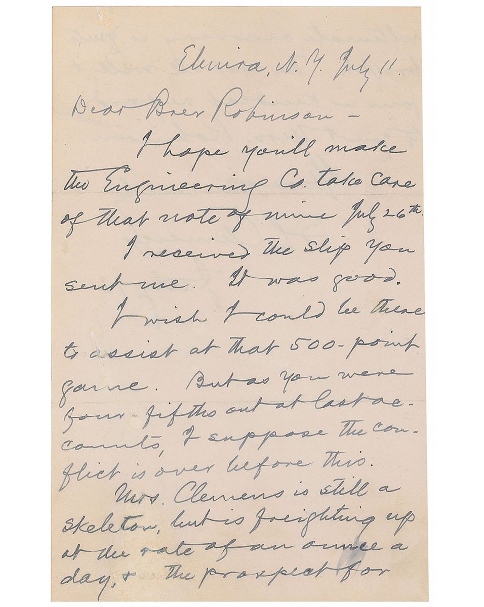 ALS signed “S. L. Clemens,” one page both sides, 5.25 x 8.5, July 11. Letter to friend and Hartford mayor, Henry ‘Brer’ Robinson. In full: “I hope you'll make the Engineering Co. take care of that note of mine July 26th. I received the slip you sent me. It was good. I wish I could be there to assist at the 500-point game. But as you were four-fifths out at last accounts, I suppose the conflict is over before this. Mrs. Clemens is still a skeleton, but is freighting up at the rate of an ounce a day, & the prospect for ultimate recovery is quite bright. The rest all well, & join in kindest regards to you & Mrs. Robinson.” In fine condition, with intersecting folds (vertical fold passing through the signature), a couple slight brushes to text, and a bit of scattered light soiling. Despite his playful jab here at his friend’s playing ability, Robinson’s 1900 death is said to have deeply affected the author, who lamented the end of the 16-year-long billiard party in which the two men partook.