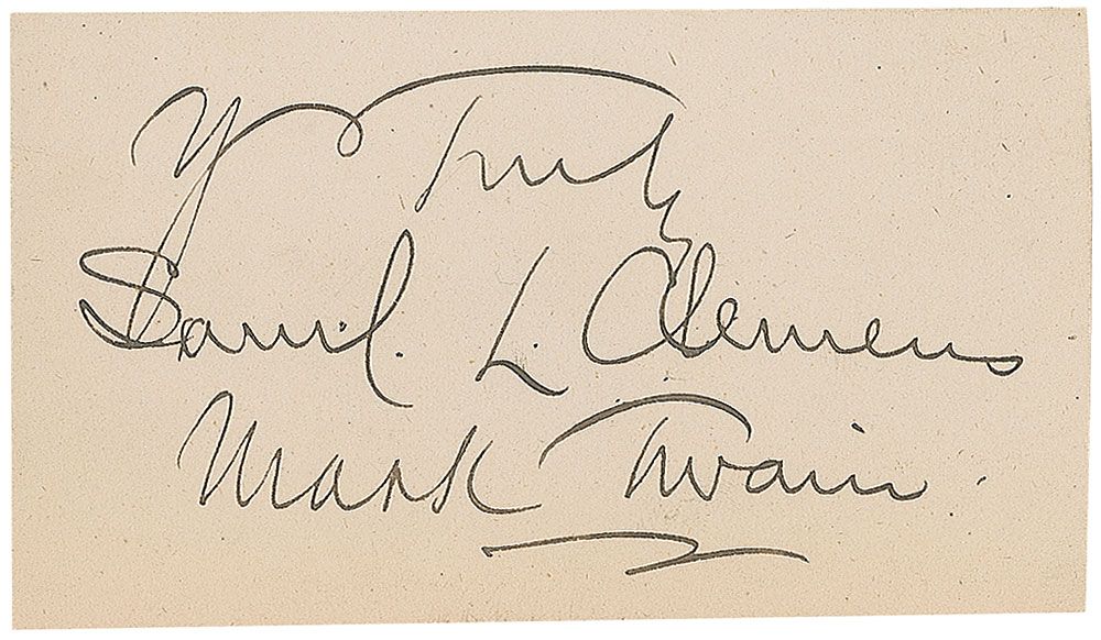 Ink signature, “Yrs truly, Saml. L. Clemens, Mark Twain,” on an off-white 3.25 x 1.75 card. In fine condition, with some slight toning along bottom edge.
