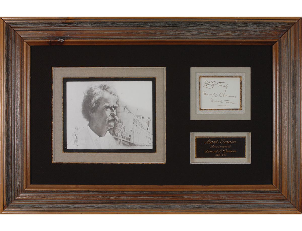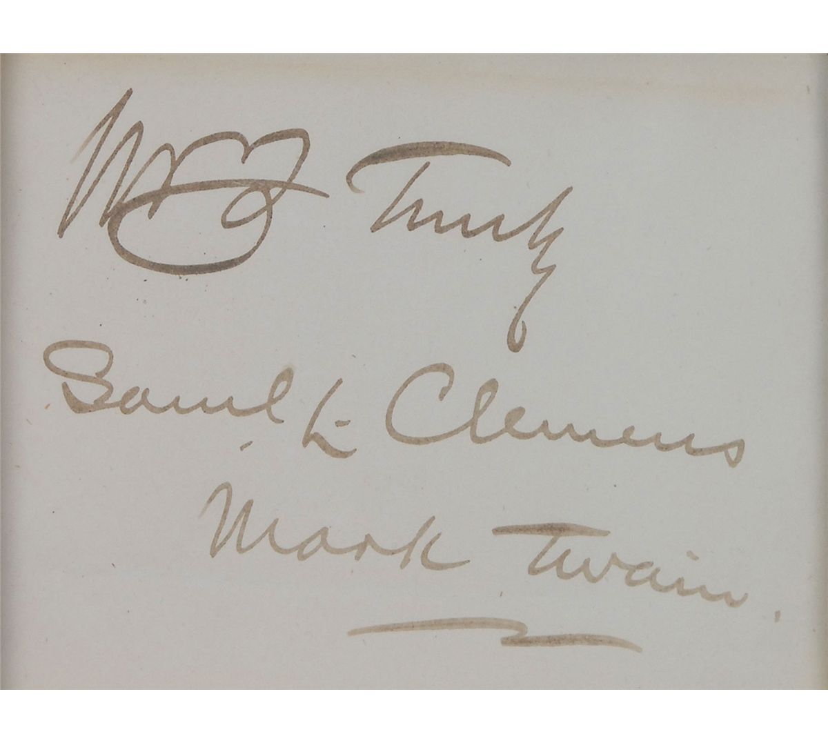 Very desirable double ink signature, “Yrs truly, Saml. L. Clemens, Mark Twain,” on an off-white 4 x 3 sheet. Triple-cloth-matted and framed with a small plaque and a print of Clemens to an overall size of 30.25 x 19.5. In fine condition. Oversized.