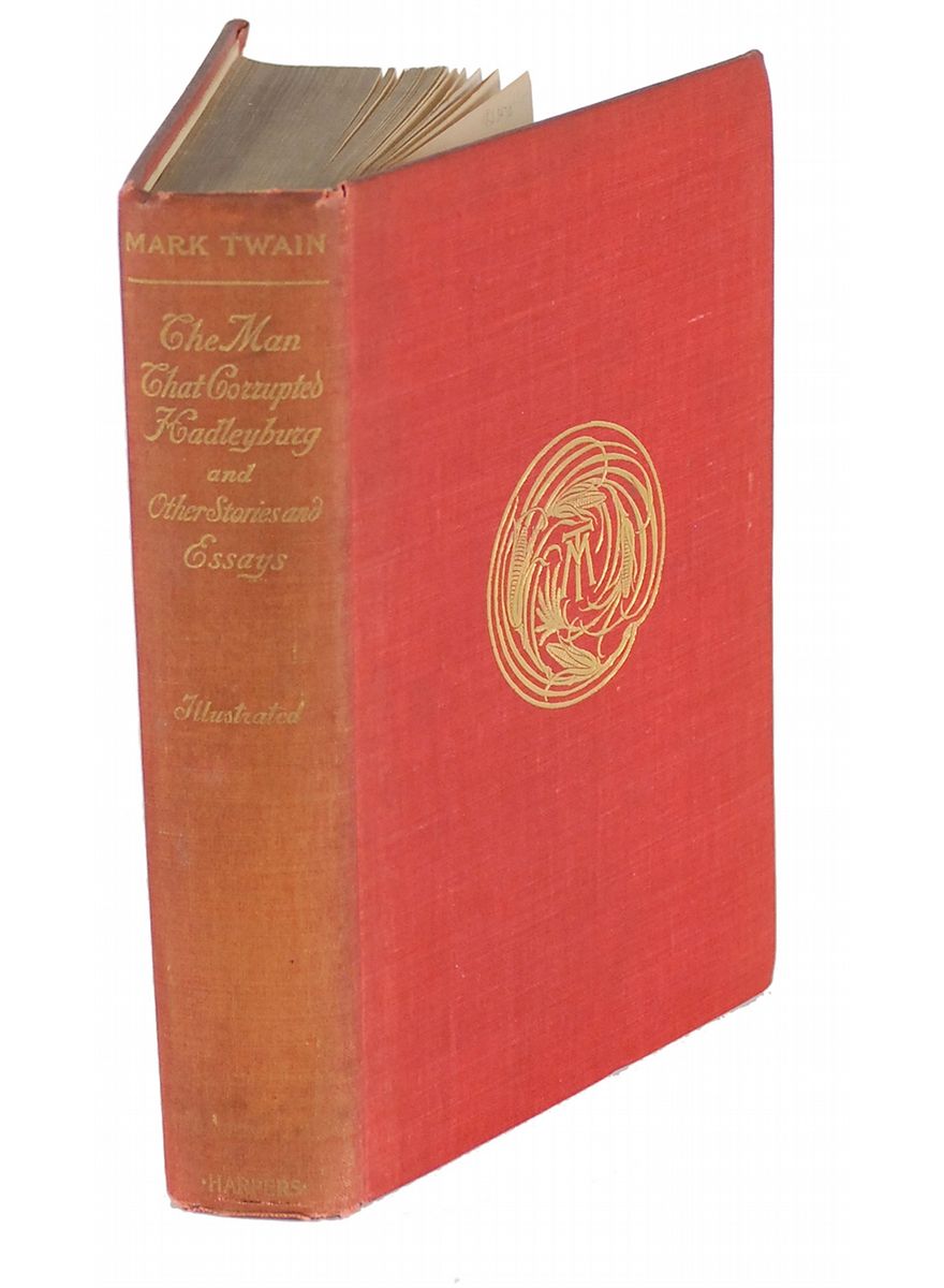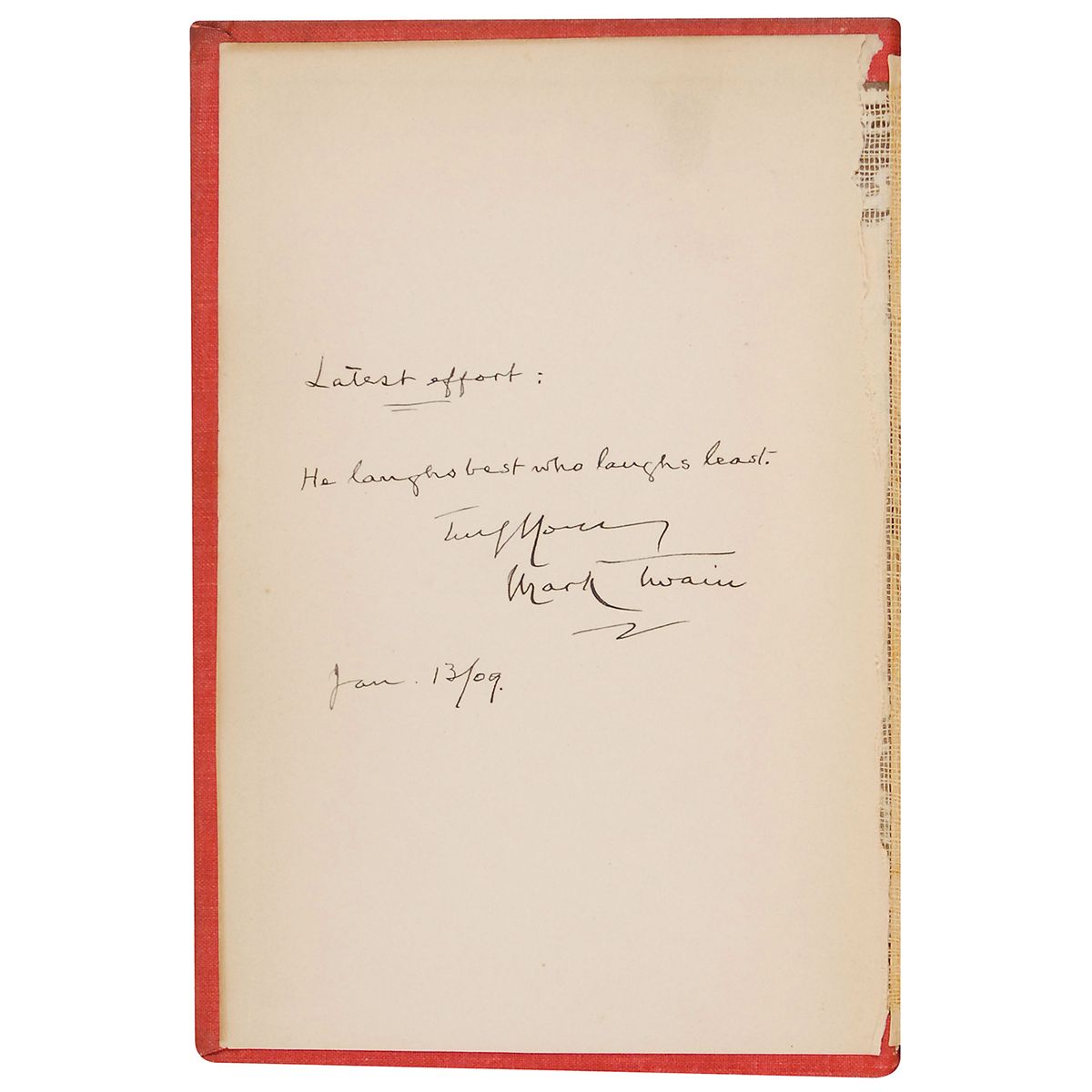 Signed book: The Man That Corrupted Hadleyburg and Other Stories and Essays. Later printing. NY: Harper and Brothers, 1902. Hardcover, 5.5 x 8, 1900 pages. Signed on the front pastedown, “Latest effort: He laughs best who laughs least. Truly yours, Mark Twain, Jan. 13/09.” Autographic condition: fine. Book condition: G+/None, with paper over front and rear interior hinges torn. An excellent example of Clemens’s characteristically wry outlook, appropriate for this particular collection, which ran the spectrum of humor, despair, and irony.