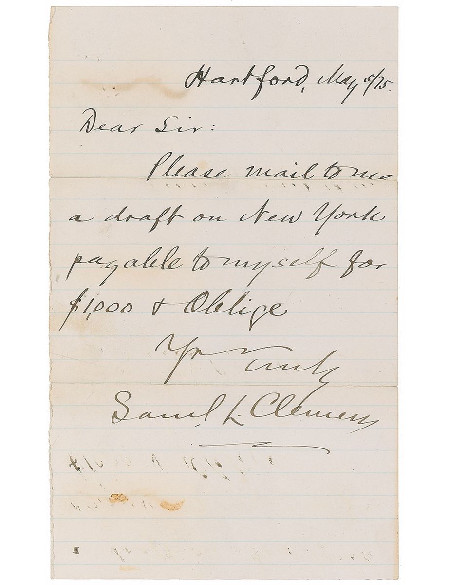 ALS signed “Saml. L. Clemens,” one page, lightly-lined, 5 x 8, May 15, 1875. Brief letter to an unidentified recipient, but probably the cashier at the First National Bank of Hartford. In full: “Please mail to me a draft on New York payable to myself for $1,000 & Oblige.” A few spots of toning, staple holes to top left, and some mirroring of signature and text from folding, otherwise fine condition. This would be the beginning of a very successful period for Clemens, bringing in a substantial income, as evidenced by this request.