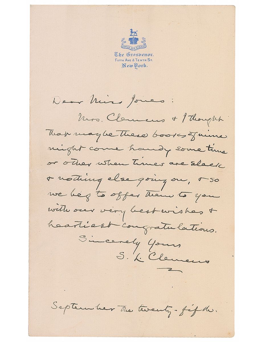 ALS signed “S. L. Clemens,” one page, 5 x 8, The Grosvenor letterhead, September 25. Letter to “Miss Jones,” daughter of Senator J. P. Jones, who shared Twain’s interest in the Paige Compositor. In full: “Mrs. Clemens & I thought that maybe these books of mine might come handy some time or other when times are slack & nothing else going on, & so we beg to offer them to you with our very best wishes & heartiest congratulations.” Central horizontal and vertical folds, a mild shade of toning, and some light corner creases, otherwise fine condition. Jones served for 30 years as United States Senator from Nevada. He made a fortune in silver mining and was a co-founder of the town of Santa Monica, California.