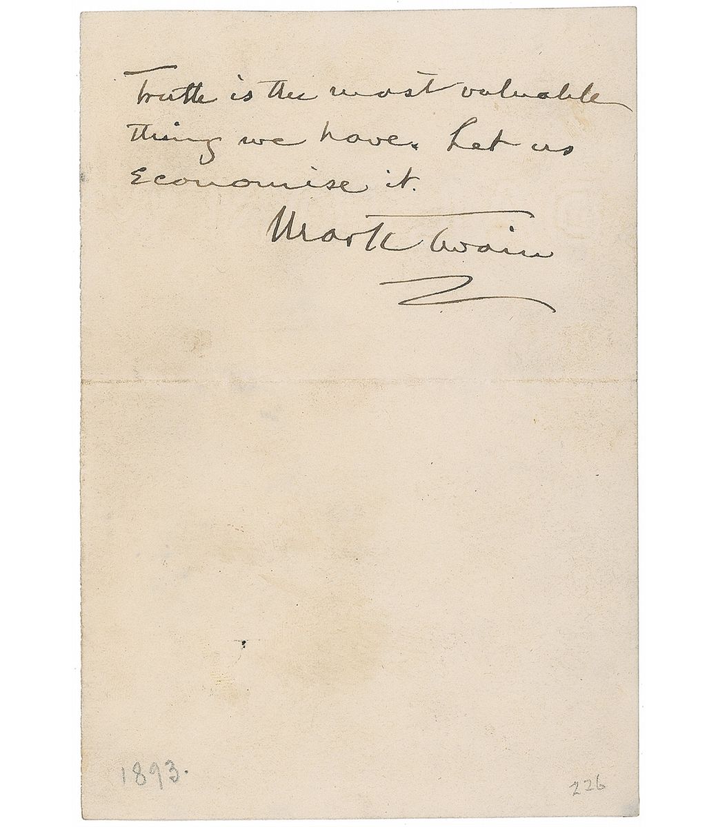 AQS on an off-white 3.75 x 5.5 sheet, signed “Mark Twain.” Twain pens a maxim from ‘Pudd'nhead Wilson's New Calendar,’ used in his travelogue entitled Following the Equator. In full: “Truth is the most valuable thing we have. Let us economise it.” In fine condition. Twain’s novel Pudd'nhead Wilson was first serialized in The Century Magazine before being published as a novel in 1894. As a promotional giveaway, the magazine produced a small pocket calendar featuring one of Pudd'nhead’s ironic aphorisms for each month of the year. The popularity of these clever sayings led Twain to incorporate more of these mottos as chapter epigraphs in Following the Equator, which he published in 1897. A highly desirable example of one of Twain’s famously witty quotes, and one that he seldom wrote out.