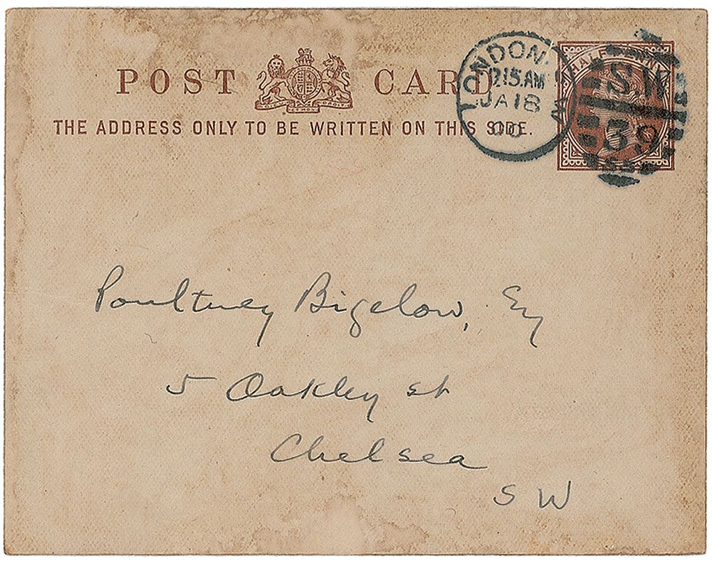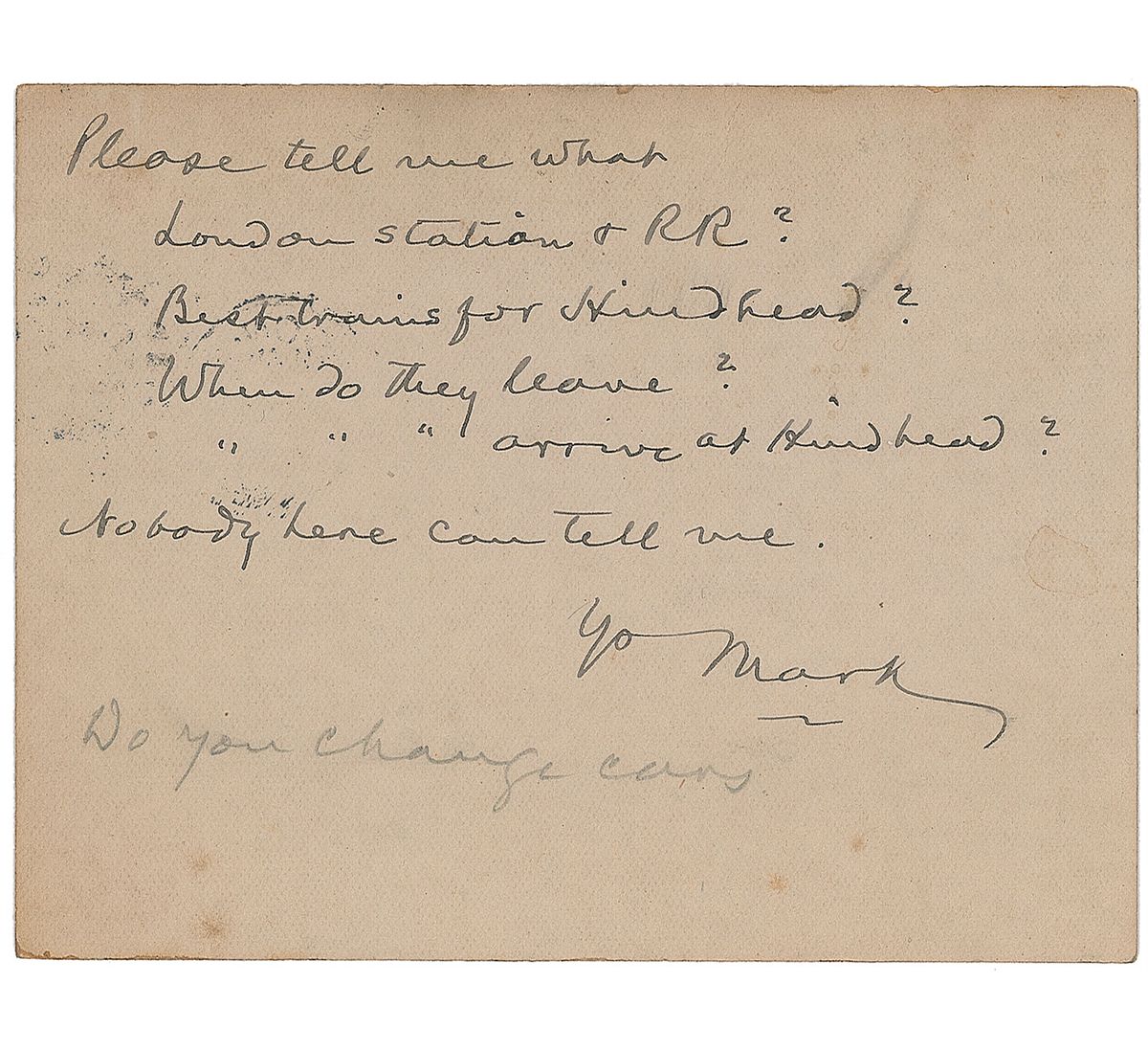 ANS signed “Mark,” one page, 4.5 x 3.5, no date. Short note to Poultney Bigelow reads, in full: “Please tell me what London station & RR? Best trains for Hindhead? When do they leave?…Arrive at Hendhead? Nobody here can tell me.” The reverse of the card is addressed in Clemens’s hand. Some scattered light toning, foxing, and soiling, and some dampstaining to address side of card, otherwise fine condition.