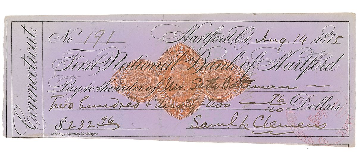Bank check, 7.75 x 3, filled out and signed by Clemens, “Samuel L. Clemens,” payable to Mr. Seth Bateman for $232.96, August 14, 1875. In fine condition, with a central vertical fold, a couple of small pinholes, and a light stamp over end of signature. Bateman owned and ran a summer resort in Newport, Rhode Island, where Clemens and his family vacationed after he completed The Adventures of Tom Sawyer in July of 1875.