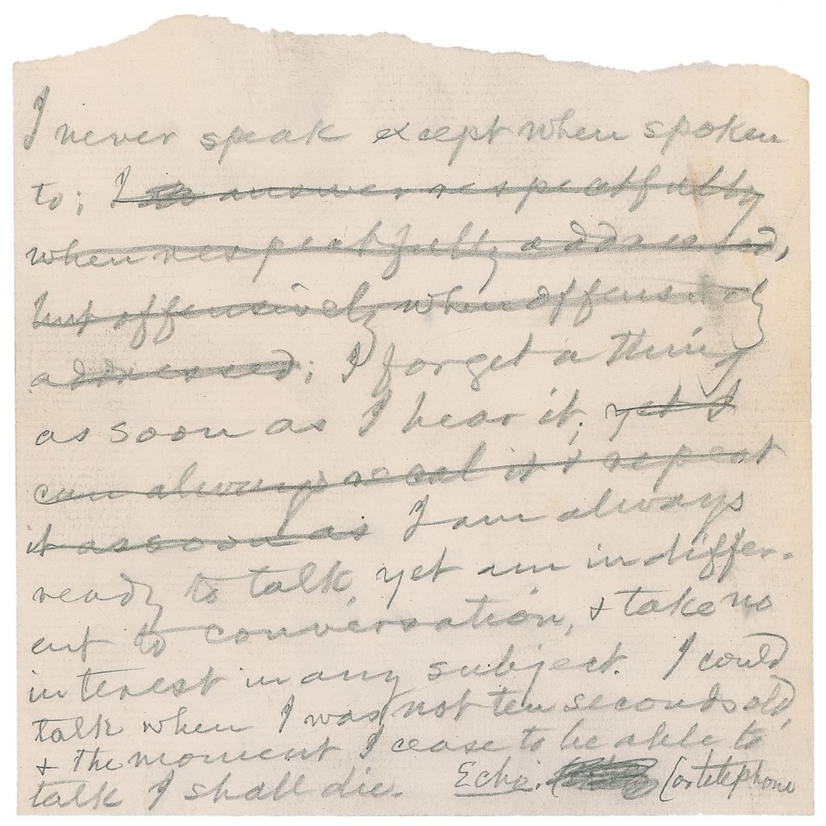 Intriguing unsigned handwritten manuscript in pencil by Clemens, one page, 5.5 x 5.25, no date. Clemens jots down and edits a riddle. In full: “I never speak except when spoken to: I answer respectfully when respectfully addressed, but offensively when offensively addressed; I forget a thing as soon as I hear it; yet I can always recal [sic] it & repeat it as soon as I am always ready to talk, yet indifferant [sic] to conversation, & take no interest in any subject. I could talk when I was not ten seconds old, & the moment I cease to be able to talk I shall die. Echo (or telephone).” He has also crossed out a few lines. In fine condition, with a rough top edge and slight brushing to pencil. This was originally sold in the 1911 Anderson auction of Clemens’s library, lot 73, loosely inserted in a copy of a facsimile edition of William Caxton’s 1489 printing of The Statutes of Henry VII. As with many new innovations and inventions, Clemens was quite interested in the telephone—he had one installed in his Nook Farm home as soon as they were available, and he made the device a critical part of his 1878 burlesque story ‘The Loves of Alonzo Fitz Clarence and Rosannah Ethelton.’ A thought-provoking piece by the witty American writer.