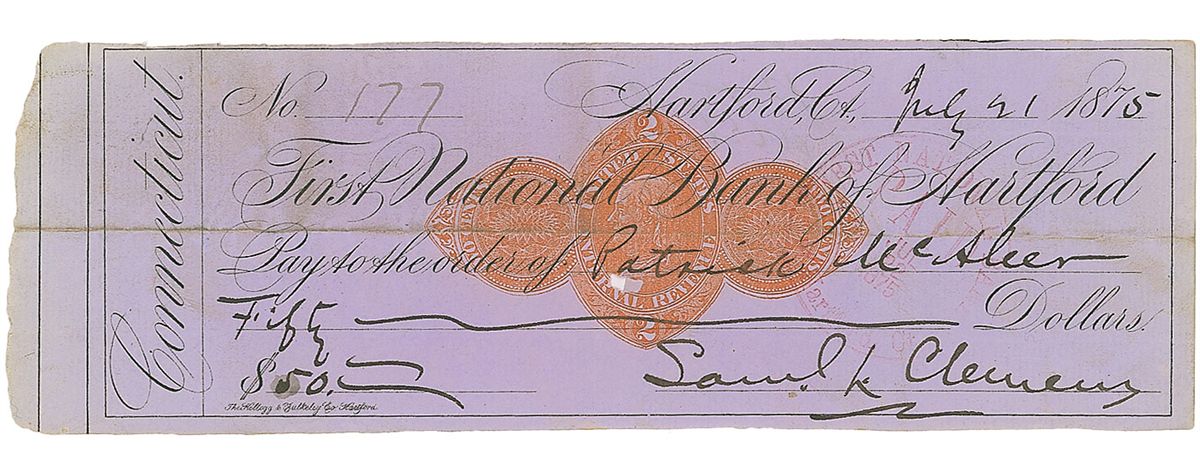 Bank check, 8.25 x 2.5, filled out and signed by Clemens, “Saml. L. Clemens,” payable to his coachman and faithful servant Patrick McAleer for $50.00, July 21, 1875. Intersecting folds, a bit of mild toning, and a small cancellation hole to center, otherwise fine condition.