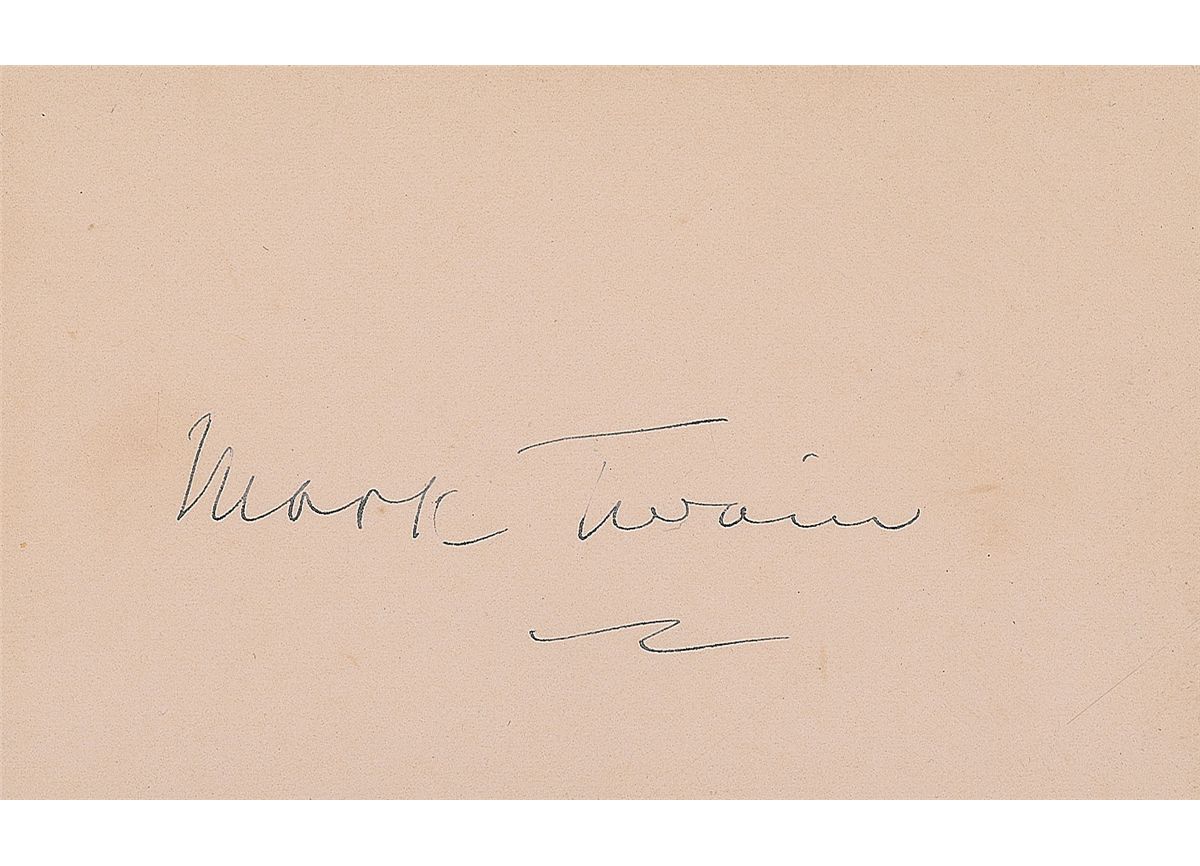 Ink signature, “Mark Twain,” on an off-white 3.5 x 2.25 card. In fine condition, with light toning and a bit of skipping to ink.