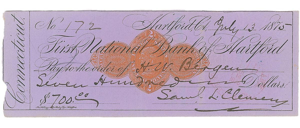 Bank check, 7.75 x 2.75, filled out and signed by Clemens, payable to H. W. Bergen for $700, July 13, 1875. In fine condition, with a few vertical folds and expected bank stamps. Clemens had just finished writing a draft of The Adventures of Tom Sawyer and hired Bergen, who kept track of proceeds and expenses for performances of Clemens’s plays, to transcribe the manuscript. On this very day, July 13, 1875, Clemens wrote to William Dean Howells, ‘I have telegraphed my theatrical agent to come here & carry off the MS & copy it.’