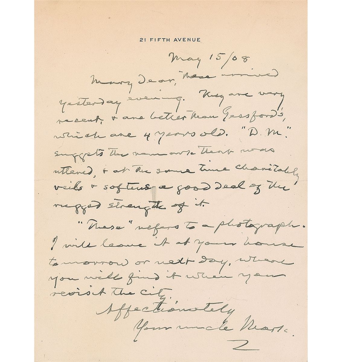 ALS signed “Your uncle Mark,” one page, 4.75 x 6.5, personal letterhead, May 15, 1908. Letter to his honorary niece, Mary Rogers, the daughter-in-law of his business advisor, Henry Rogers. In part: “These arrived yesterday evening. They are very recent, & are better than Gessford’s, which are 4 years old. ‘D. M.’ suggests the remark that was uttered…softens a good deal of the rugged strength of it. ‘These’ refers to a photograph. I will leave it at your house tomorrow or next day.” Professionally silked on the reverse. In fine condition. Joseph Gessford was a renowned photographer with a studio on Fifth Avenue in New York City, and “D. M.” likely refers to David Munro, assistant editor of the literary magazine The North American Review. A neatly penned letter by the great author.