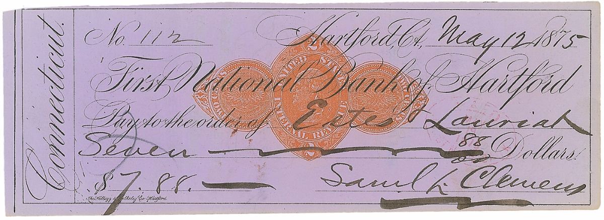 First National Bank of Hartford check, 7.75 x 2.75, boldly filled out and signed by Clemens, “Samuel L. Clemens,” payable to Estes & Lauriat for $7.88, May 12, 1875. In fine condition, with expected check wear. A great example from the year before he published the classic The Adventures of Tom Sawyer.